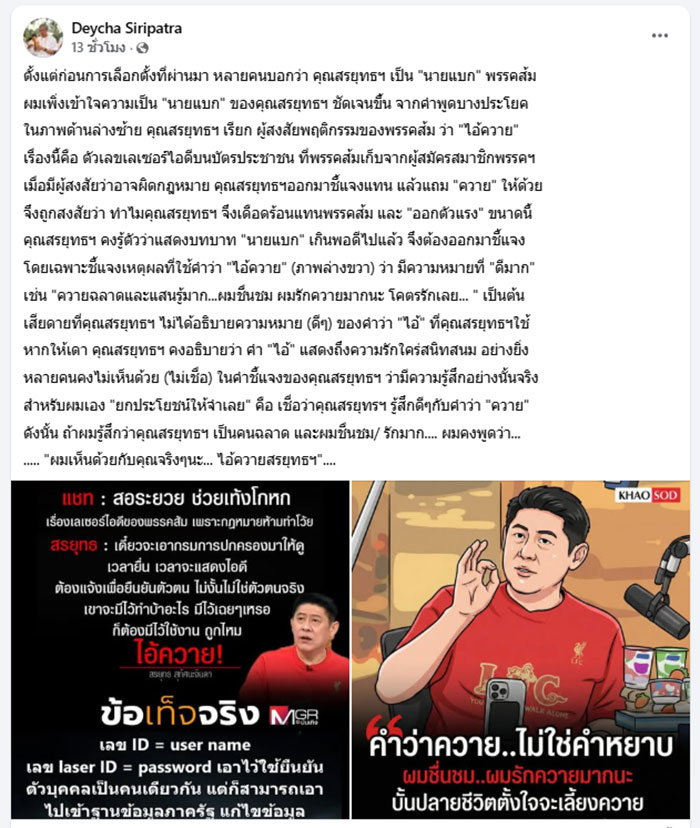 18 กุมภาพันธ์ 2569 อ.เดชา ศิริภัทร หมอพื้นบ้านจังหวัดสุพรรณบุรี ประธานมูลนิธิข้าวขวัญ เจ้าของสูตรน้ำมันกัญชา (ตำรับหมอเดชา) โพสต์ข้อความผ่านเฟซบุ๊ก ระบุว่า ตั้งแต่ก่อนการเลือกตั้งที่ผ่านมา หลายคนบอกว่า คุณสรยุทธฯ เป็น "นายแบก" พรรคส้ม
