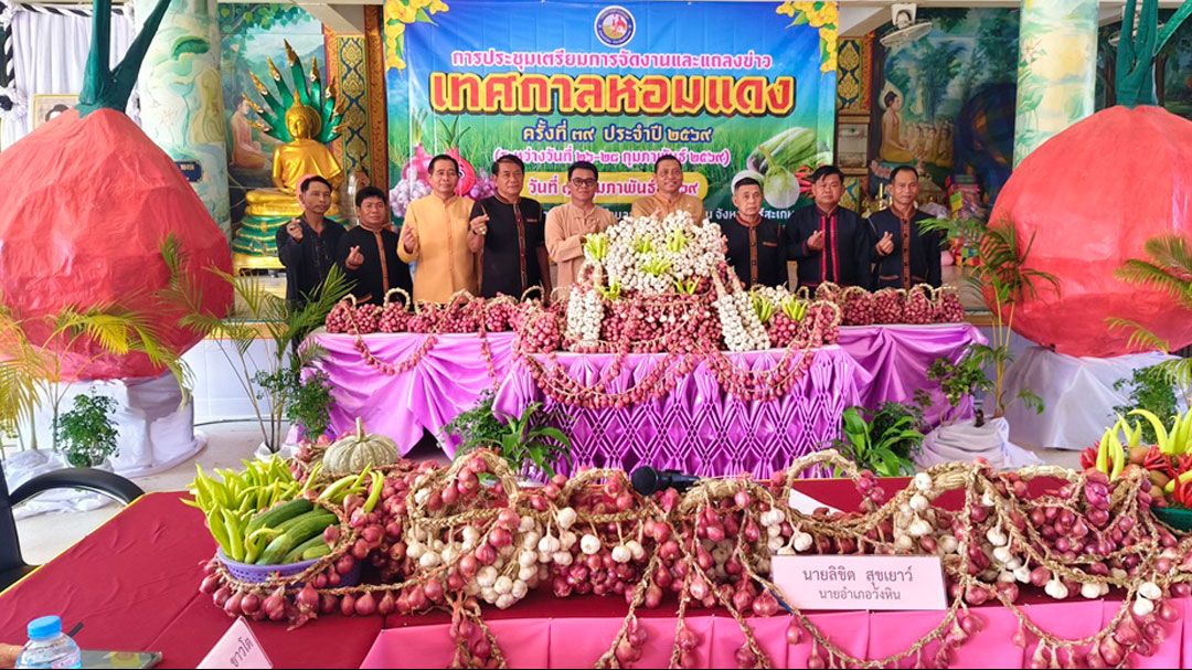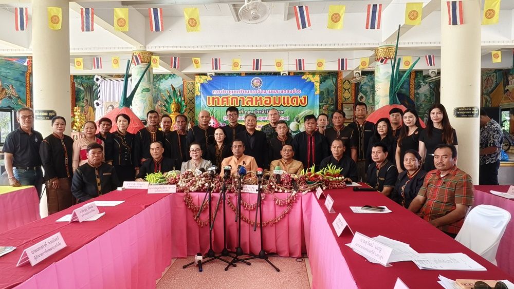 วันที่ 18 ก.พ. 2569 ที่บริเวณวัดบ้านขุมคำ ต.บุสูง อ.วังหิน จ.ศรีสะเกษ นายลิขิต สุขเยาว์ นายอำเภอวังหิน เป็นประธานในพิธีเปิดการประชุมและแถลงข่าวเตรียมจัดงาน "เทศกาลหอมแดง" ครั้งที่ 39 ประจำปี 2569 โดยมีนายรักชาติ ฤทธิ์เดช นายกเทศมนตรีตำบลบุสูง หัวหน้าส่วนราชการ ผู้บริหารสถานศึกษา กำนัน ผู้ใหญ่บ้าน เกษตรกรผู้ปลูกหอมแดงและชาวบ้านในพื้นที่ให้การต้อนรับและร่วมกิจกรรมด้วย
