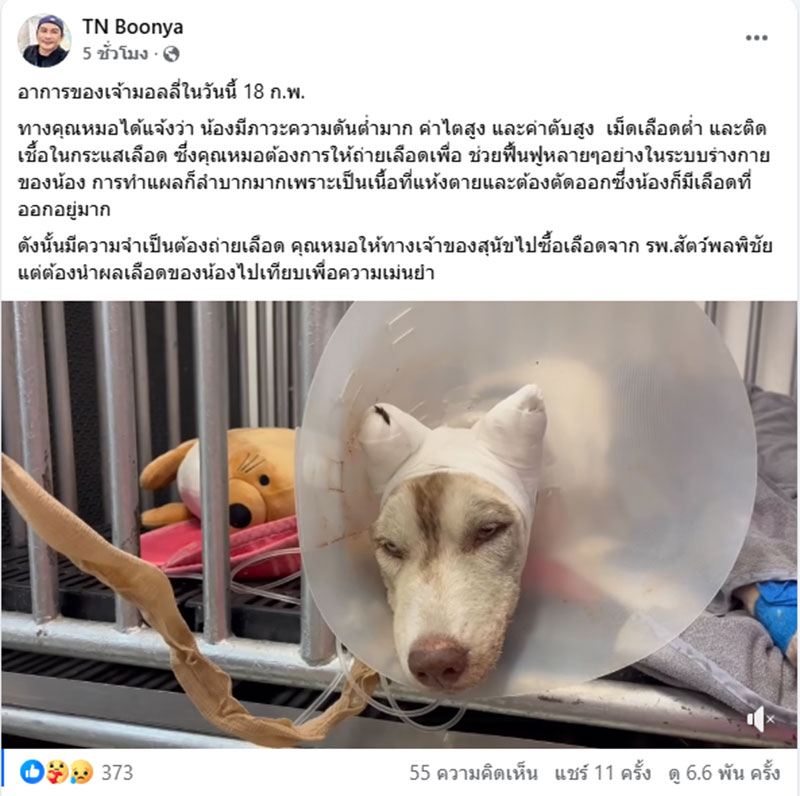 ล่าสุดผู้ใช้เฟซบุ๊กได้ออกมาอัปเดตอาการของ เจ้ามอลลี่ สุนัขพันธุ์ไซบีเรียนฮัสกี ล่าสุดในวันนี้ ระบุว่า "อาการของเจ้ามอลลี่ในวันนี้ 18 ก.พ. ทางคุณหมอได้แจ้งว่า น้องมีภาวะความดันต่ำมาก ค่าไตสูง และค่าตับสูง เม็ดเลือดต่ำ และติดเชื้อในกระแสเลือด ซึ่งคุณหมอต้องการให้ถ่ายเลือดเพื่อ ช่วยฟื้นฟูหลายๆอย่างในระบบร่างกายของน้อง การทำแผลก็ลำบากมากเพราะเป็นเนื้อที่แห้งตายและต้องตัดออกซึ่งน้องก็มีเลือดที่ออกอยู่มาก ดังนั้นมีความจำเป็นต้องถ่ายเลือด คุณหมอให้ทางเจ้าของสุนัขไปซื้อเลือดจาก รพ.สัตว์พลพิชัย แต่ต้องนำผลเลือดของน้องไปเทียบเพื่อความเม่นยำ"