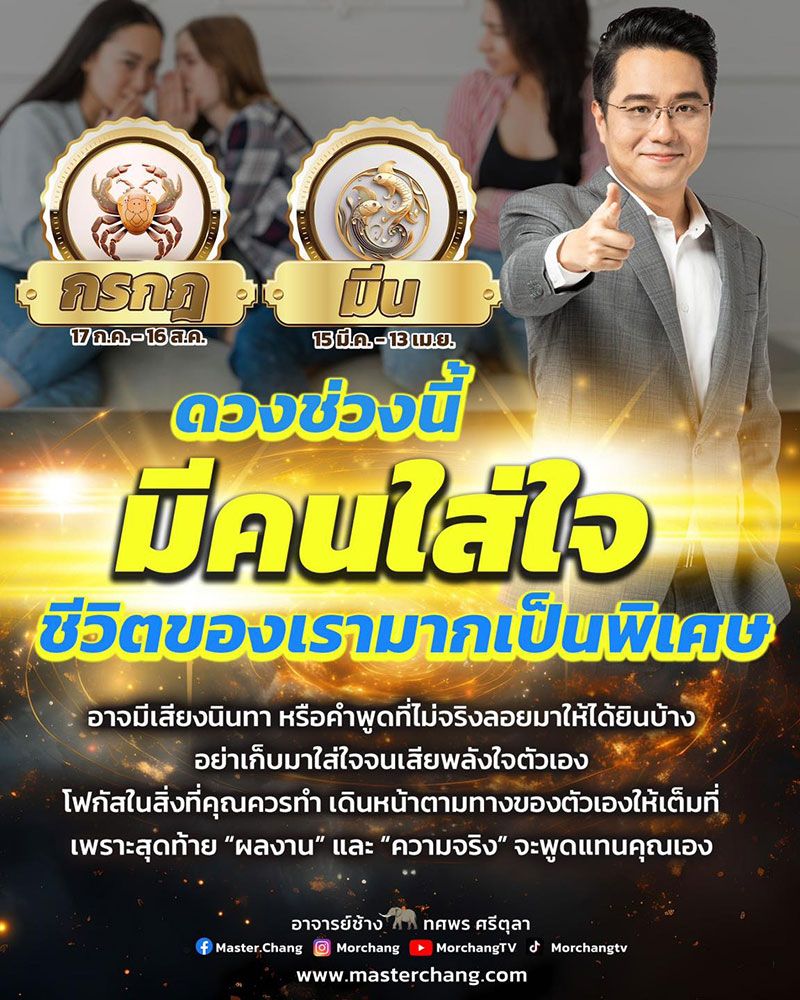 ราศีกรกฎ (ผู้ที่เกิดตั้งแต่วันที่ 17 ก.ค.-16 ส.ค.) ราศีมีน (ผู้ที่เกิดตั้งแต่วันที่ 15 มี.ค.-13 เม.ย.) ดวงช่วงนี้มีคนใส่ใจ ชีวิตของเรามากเป็นพิเศษ อาจมีเสียงนินทา หรือคำพูดที่ไม่จริงลอยมาให้ได้ยินบ้าง อย่าเก็บมาใส่ใจจนเสียพลังใจตัวเอง โฟกัสในสิ่งที่คุณควรทำ เดินหน้าตามทางของตัวเองให้เต็มที่ เพราะสุดท้าย "ผลงาน" และ "ความจริง" จะพูดแทนคุณเอง