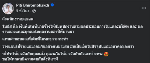 ต๊อด ปิติ ภิรมย์ภักดี ผู้บริหารบุญรอดบริวเวอรี่ ประกาศข่าวดีโบนัสพนักงานประจำปี พร้อมฝากข้อคิดเรื่องการใช้จ่ายและการออม ทำโซเชียลร่วมยินดีรับต้นปี