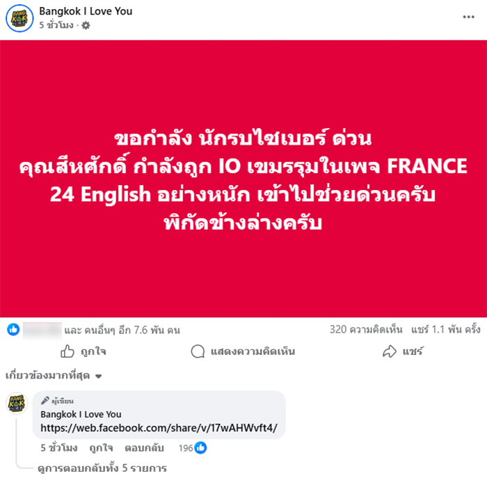 25 กุมภาพันธ์ 2569 เพจเฟซบุ๊ก "Bangkok I Love You" โพสต์ข้อความระบุว่า "ขอกำลัง นักรบไซเบอร์ ด่วน คุณสีหศักดิ์ กำลังถูก IO เขมรรุมในเพจ FRANCE 24 English อย่างหนัก เข้าไปช่วยด่วนครับ พิกัดข้างล่างครับ"