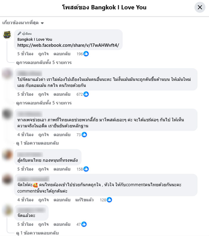 จากนั้นมีผู้เข้ามาคอมเมนต์จำนวนมาก อาทิเช่น ไปจัดมาแล้วค่า เราไม่ต้องไปเถียงในเม้นคนอื่นนะคะ ไม่งั้นเม้นมันจะถูกดันขึ้นด้านบน ให้เม้นใหม่เลย กับคอมเม้น กดไจ คนไทยด้วยกัน , ทางเพจช่วยเอา ภาพที่ไทยเคยช่วยพวกลี้ภัย มาโพสต์เยอะๆ ค่ะ จะได้แชร์ต่อๆ กันไป ให้เห็นความจริงในอดีต เรายืนยันด้วยหลักฐาน , สู้ครับคนไทย กองหนุนที่ทรงพลัง , จัดให้ค่ะ คนไทยต้องเข้าไปช่วยกันกดถูกใจ , หัวใจ ให้กับcommentคนไทยด้วยกันนะคะ commentนั้นจะได้ถูกดันค่ะ , จัดแล้วคะ