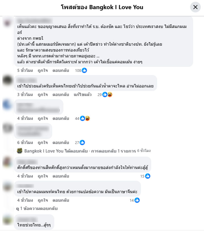 เห็นแล้วคะ ขออนุญาตเสนอ สิ่งที่เราทำได้ ร.บ. ต้องชัด และ โชว์ว่า ประเทศเราสงบ ไม่มีสแกมเมอร์ ต่างจาก กพชใ (ปท.เค้านี้ แสกมเมอร์ชัดเจนมาก) แต่ เค้าปิดข่าว ทำให้ต่างชาติบางปท. ยังไม่รู้เลย และ รักษาความสงบของการท่องเที่ยวไว้ หลังๆ มี นทท.เกรดต่ำมาทำลายภาพอยู่เยอะ ...แล้ว ต่างชาติเค้ามีการคิดวิเคราะห์ มากกว่า เค้าไม่เชื่อแค่คอมเม้น ง่ายๆ , เข้าไปช่วยแล้วครับเห็นคนไทยเข้าไปช่วยกันแล้วน้ำตาจะไหล อ่านไม่ออกเลย , ศักดิ์ศรีของท่านสีหศักดิ์สูงกว่าเหมนตั้งมากมายขอส่งกำลังใจให้ท่านค่ะสู้สู้ , เข้าไปหาคอมเมนท์คนไทย ด้วยการแปลข้อความ มันเป็นภาษาจีนค่ะ , ไทยช่วยไทย...สู้ๆๆ เป็นต้น
