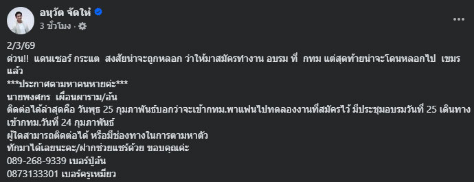 2 มีนาคม 2569 เกิดกระแสช่วยกันตามหาคนหายในโลกออนไลน์ หลังเพจเฟซบุ๊ก อนุวัต เฟื่องทองแดง หรือ “อนุวัต จัดให้” โพสต์ประกาศตามหา นายพงศกร เผื่อนผาราม หรือ “อ้น” แดนเซอร์ของ กระแต อาร์สยาม ซึ่งขาดการติดต่อกับครอบครัวและคนใกล้ชิดอย่างกะทันหัน