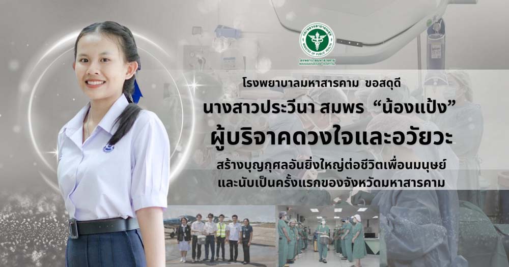 วันที่ 6 มีนาคม 2569 เพจเฟซบุ๊ก โรงพยาบาลมหาสารคาม โพสต์ข้อความแสดงความอาลัยอย่างสุดซึ้ง พร้อมสดุดีในความเสียสละอันยิ่งใหญ่ของ น.ส.ประวีนา สมพร นิสิตชั้นปีที่ 1 หลักสูตรดุริยางคศาสตรบัณฑิต วิทยาลัยดุริยางคศิลป์ มหาวิทยาลัยมหาสารคาม อายุ 20 ปี ผู้ได้มอบโอกาสแห่งชีวิตให้แก่เพื่อนมนุษย์ ด้วยการบริจาคหัวใจ ตับ ไต และดวงตา นับเป็นผู้บริจาครายที่ 4 ของปีงบประมาณ 2569 และยังถือเป็นรายแรกของโรงพยาบาลมหาสารคามที่สามารถบริจาคหัวใจได้