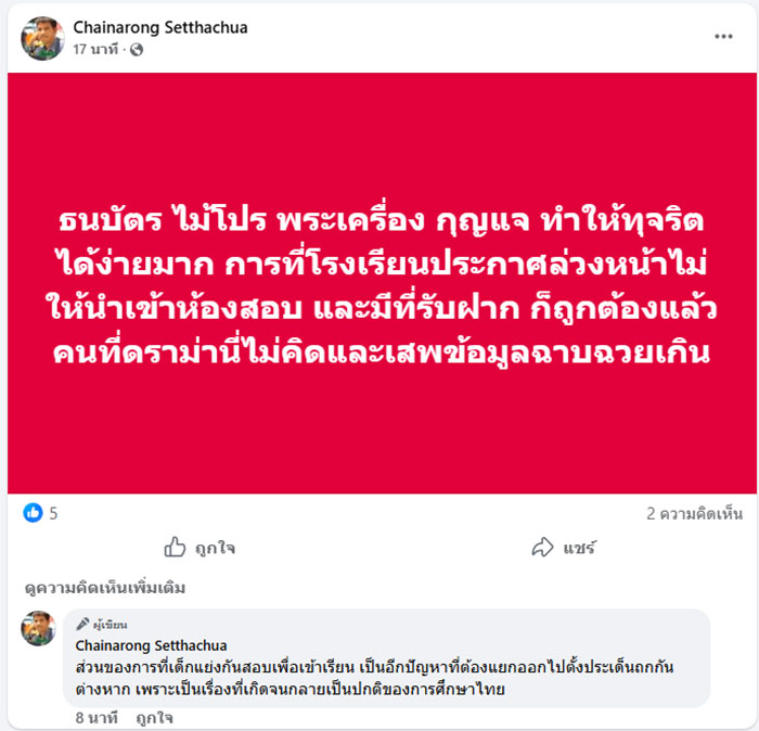 พร้อมยังโพสต์ข้อความในคอมเมนต์ด้วยว่า "ส่วนของการที่เด็กแย่งกันสอบเพื่อเข้าเรียน เป็นอีกปัญหาที่ต้องแยกออกไปตั้งประเด็นถกกันต่างหาก เพราะเป็นเรื่องที่เกิดจนกลายเป็นปกติของการศึกษาไทย"