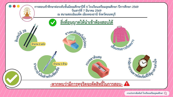 ขณะที่ "งานประชาสัมพันธ์ โรงเรียนเตรียมอุดมศึกษา" ได้เผยภาพประชาสัมพันธ์ การสอบเข้าศึกษาต่อระดับชั้นมัธยมศึกษาปีที่ 4 โรงเรียนเตรียมอุดมศึกษา ปีการศึกษา 2569 ในวันเสาร์ที่ 7 มีนาคม 2569 ณ สนามสอบอินแพ็ค เมืองทองธานี จังหวัดนนทบุรี โดยระบุว่า สิ่งที่อนุญาตให้นำเข้าห้องสอบได้ คือ ดินสอไม้ 2B , ปากกาน้ำเงินสำหรับเขียนชื่อ , ยางลบดินสอไม่มีปลอก , กบเหลาดินสอ , เสื้อแขนยาวกันหนาว , นาฬิกาธรรมดาชนิดเข็มที่ใช้ดูเวลาเท่านั้น