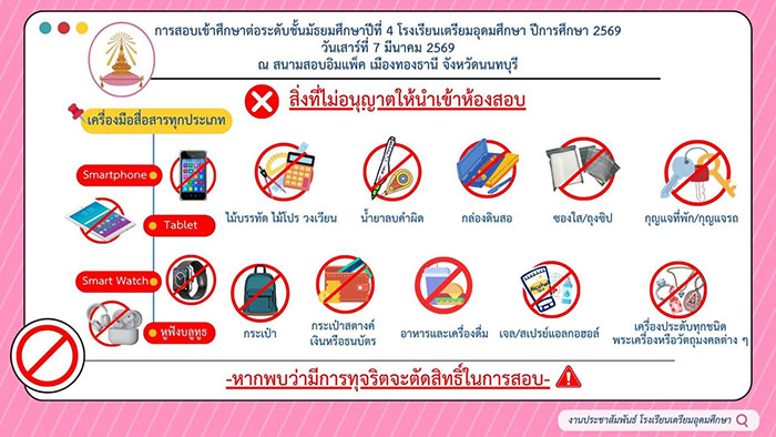 ส่วน สิ่งที่ไม่อนุญาตให้นำเข้าห้องสอบ คือ เครื่องมือสื่อสารทุกประเภท Smartphone , Tablet , Smart Watch , หูฟังบลูทูธ , กระเป๋า , ไม้บรรทัด , ไม้โปร วงเวียน , กระเป๋าสตางค์ เงิน หรือธนบัตร , น้ำยาลบคำผิด , กล่องดินสอ , อาหารและเครื่องดื่ม , ซองใส/ถุงซิป , เจล/สเปรย์แอลกอฮอล์ , กุญแจที่พัก/กุญแจรถ , เครื่องประดับทุกชนิด พระเครื่องหรือวัตถุมงคลต่างๆ (ข่าวที่เกี่ยวข้อง : พกอะไรเข้าห้องสอบเตรียมอุดมฯได้บ้าง ? กางระเบียบเข้ม หลังดรามาเงินสดวางทิ้งเกลื่อน)
