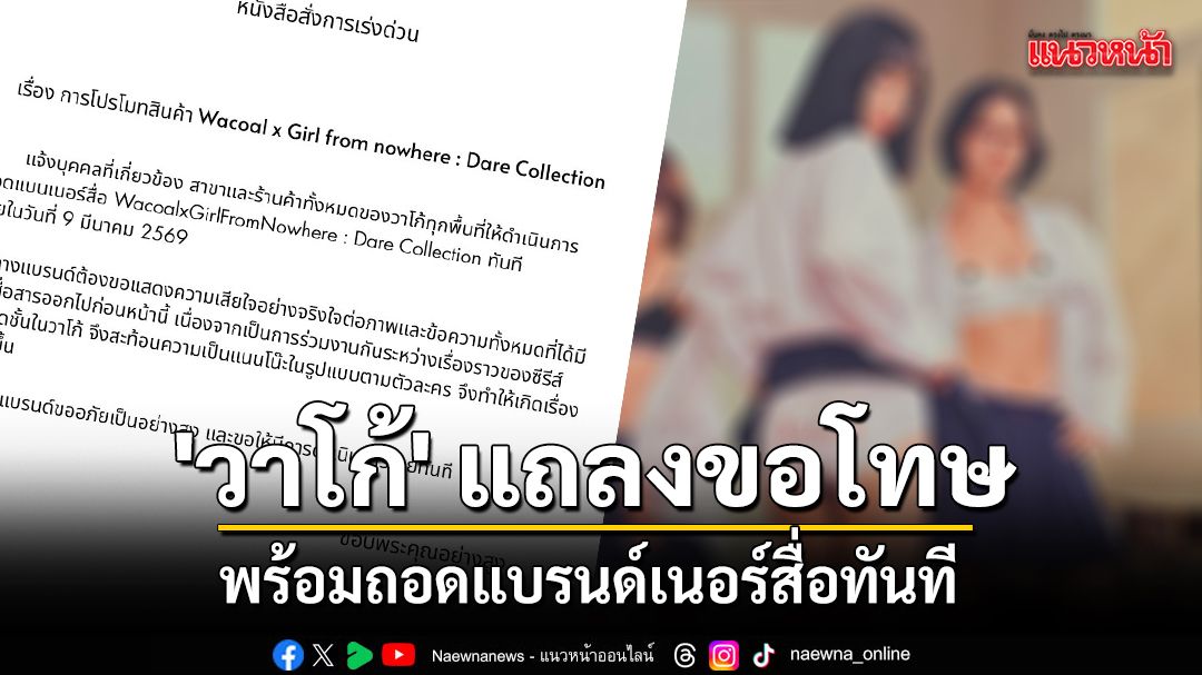 แจ้งบุคคลที่เกี่ยวข้อง สาขาและร้านค้าทั้งหมดของวาโก้ทุกพื้นที่ให้ดำเนินการถอดแบบเนอร์สื่อ Wacoal x Girl From nowhere : Dare Collection ทันที ภายในวันที่ 9 มีนาคม 2569