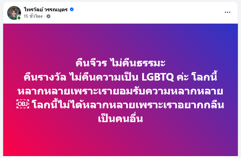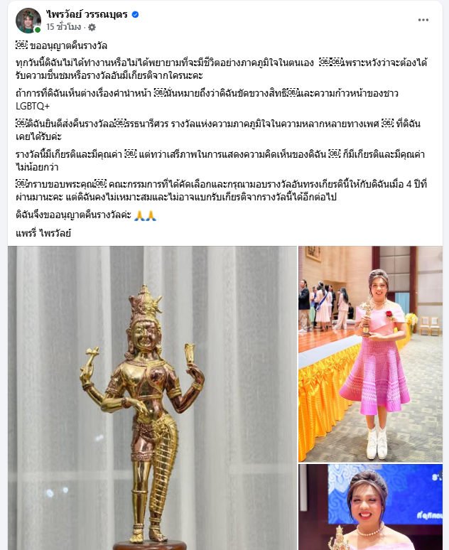 กลายเป็นประเด็นร้อนบนโลกโซเชียลทันที เมื่อ แพรรี่ ไพรวัลย์ วรรณบุตร อินฟลูเอนเซอร์ชื่อดัง ได้ออกมาโพสต์ข้อความผ่านเฟซบุ๊กส่วนตัว ประกาศส่งคืนรางวัล "อรรธนารีศวร" ซึ่งเป็นรางวัลแห่งความภาคภูมิใจในความหลากหลายทางเพศที่เคยได้รับเมื่อ 4 ปีก่อน