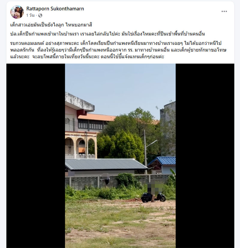 เจ้าของโพสต์ชี้แจงเพิ่มเติม หลังจากคลิปถูกแชร์ออกไป เจ้าของโพสต์ได้ระบุข้อความชี้แจงเพื่อให้เกิดความเข้าใจที่ตรงกันว่า นักเรียนปีนกำแพงเข้ามาในเขตบ้าน จึงจำเป็นต้องไล่กลับไป ต้องการเตือนภัยและให้เห็นพฤติกรรมหนีเรียนของเด็กนักเรียนที่สร้างความเดือดร้อนให้เพื่อนบ้าน ไม่ได้มีเจตนาปรักปรำเรื่องชู้สาว