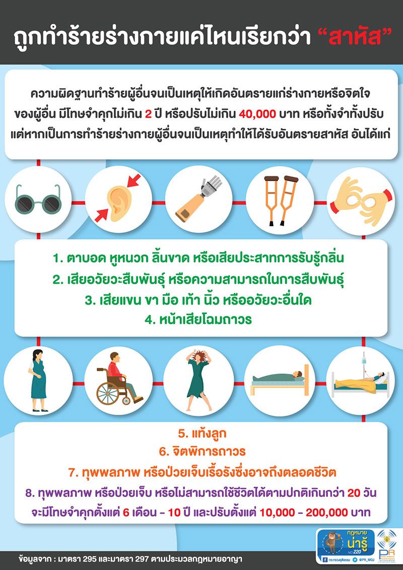 วันที่ 13 มีนาคม 2569 เพจเฟซบุ๊ก กระทรวงยุติธรรม Ministry Of Justice, Thailand โพสต์แชร์ข้อมูล กฎหมายน่ารู้ ตอน ถูกทำร้ายร่างกายแค่ไหนเรียกว่า "สาหัส" ????