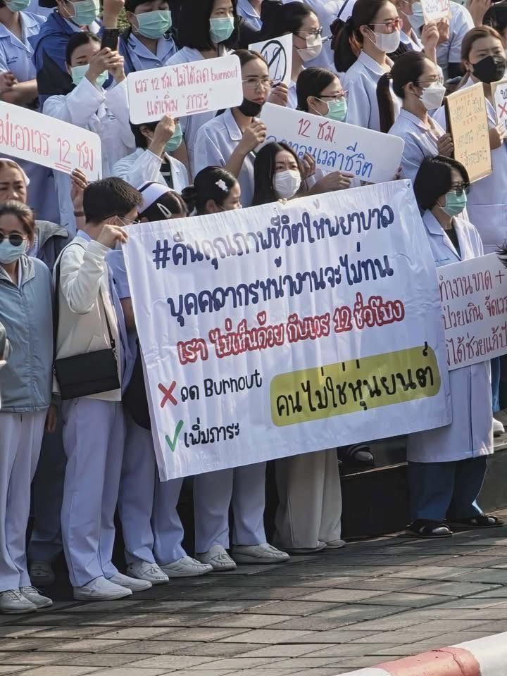 โดยบรรยากาศการรวมตัวเต็มไปด้วยเสียงสะท้อนจากผู้ปฏิบัติงานจริง โดยมีป้ายข้อความที่สื่อถึงความอัดอั้นและภาระที่หนักอึ้ง เช่น "คืนคุณภาพชีวิตให้พยาบาล บุคลากรหน้างานจะไม่ทน", "12 ชม. ไม่ได้ลด burnout แต่เพิ่มภาระ", "โปรดช่วยรับฟังความคิดเห็นของ 'ผู้ปฏิบัติงาน'", "เวร 12 ชม. มีผลต่อครอบครัว" และประโยคที่สะท้อนความรู้สึกได้ชัดเจนที่สุดคือ "ลด Burnout คนไม่ใช่หุ่นยนต์"