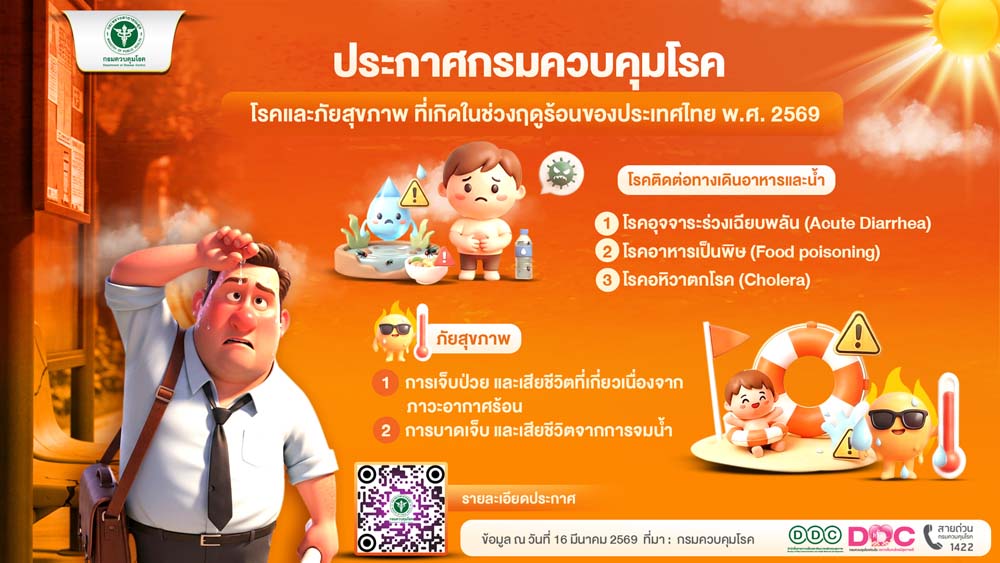 วันที่ 16 มีนาคม 2569 นายแพทย์มณเฑียร คณาสวัสดิ์ อธิบดีกรมควบคุมโรค กล่าวว่า ขณะนี้ประเทศไทยได้เข้าสู่ฤดูร้อนอย่างเป็นทางการ ส่งผลให้หลายพื้นที่มีสภาพอากาศร้อนอบอ้าว ซึ่งอาจทำให้ประชาชนเจ็บป่วยจากโรคและภัยสุขภาพที่เกี่ยวข้องกับสภาพอากาศได้ กรมควบคุมโรคจึงได้ออก ประกาศกรมควบคุมโรค เรื่อง การป้องกันโรคและภัยสุขภาพที่เกิดในช่วงฤดูร้อนของประเทศไทย พ.ศ. 2569 เพื่อให้ประชาชนสามารถดูแลสุขภาพของตนเองได้อย่างถูกต้อง