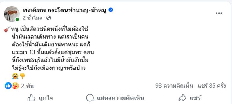 วันที่ 20 มีนาคม 2569 “น้าหมู” พงษ์เทพ กระโดนชำนาญ ศิลปินเพลงเพื่อชีวิตนักอนุรักษ์ โพสต์ข้อความระบุว่า หนู เป็นสัตวชนิดหนึ่งที่ไม่ต้องใช้ น้ำมันเวลาเดินทาง แต่เราเป็นคน ต้องใช้น้ำมันเติมยานพาหนะ แต่ก็ แวะมา 13 ปั้มแล้วตั้งแต่ชุมพร ตอน นี้ถึงเพชรบุรีแล้วไม่มีน้ำมันสักปั้ม ไม่รู้จะไปถึงเมืองกาญฯหรือป่าว