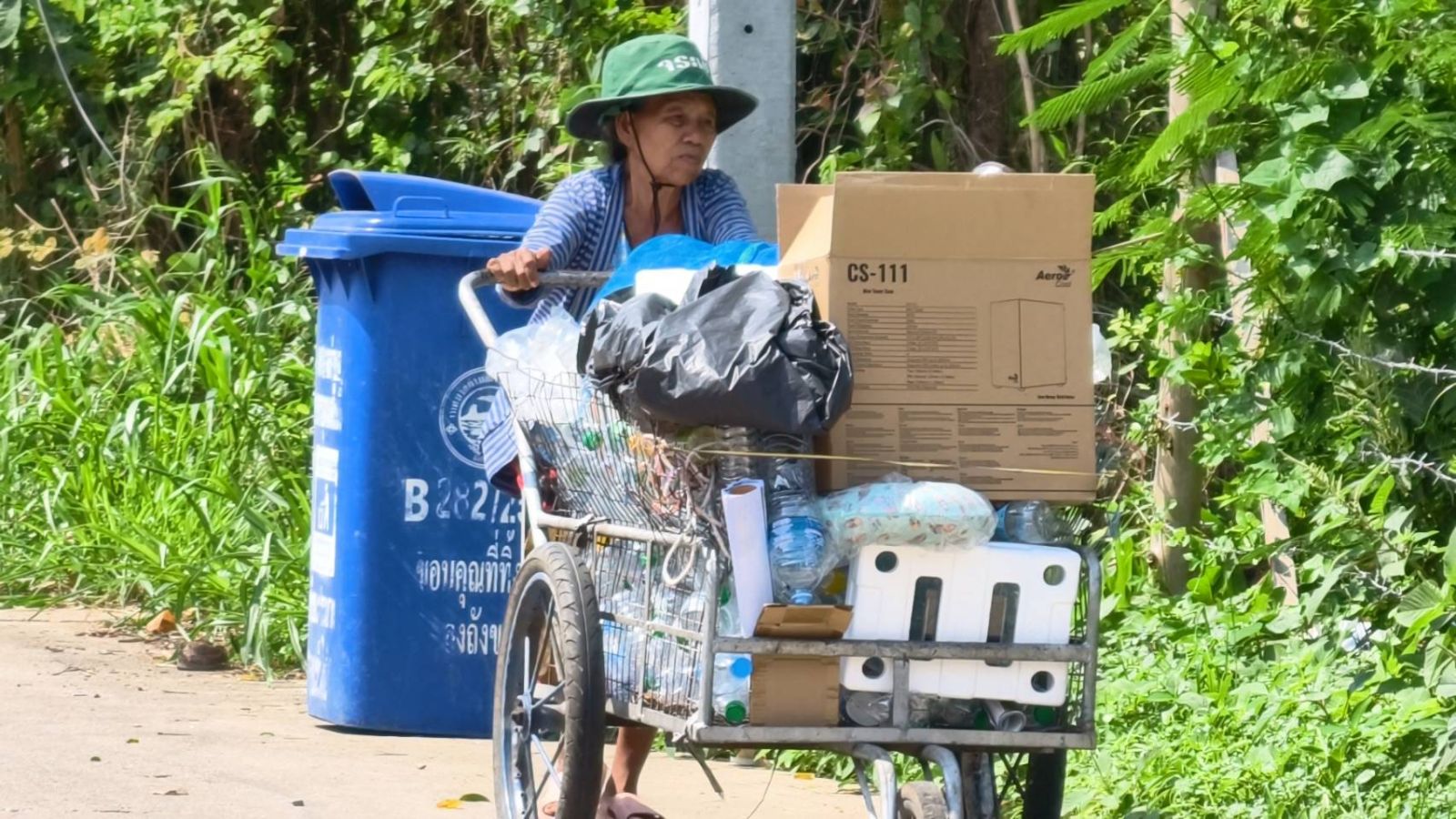 ผู้สื่อข่าวลงพื้นที่ หมู่ที่ 3 ต.สัตหีบ อ.สัตหีบ จ.ชลบุรี พบกับ “นางเตียม เทียมเมือง” อายุ 76 ปี กำลังค่อยๆ เข็นรถเข็นคู่ใจ เดินเก็บขวดและของเก่าตามถนนในชุมชนเพื่อนำไปขายหาเงินเลี้ยงชีพ