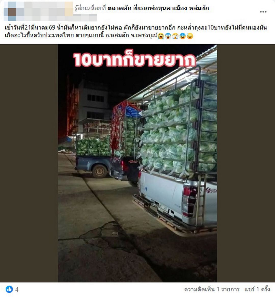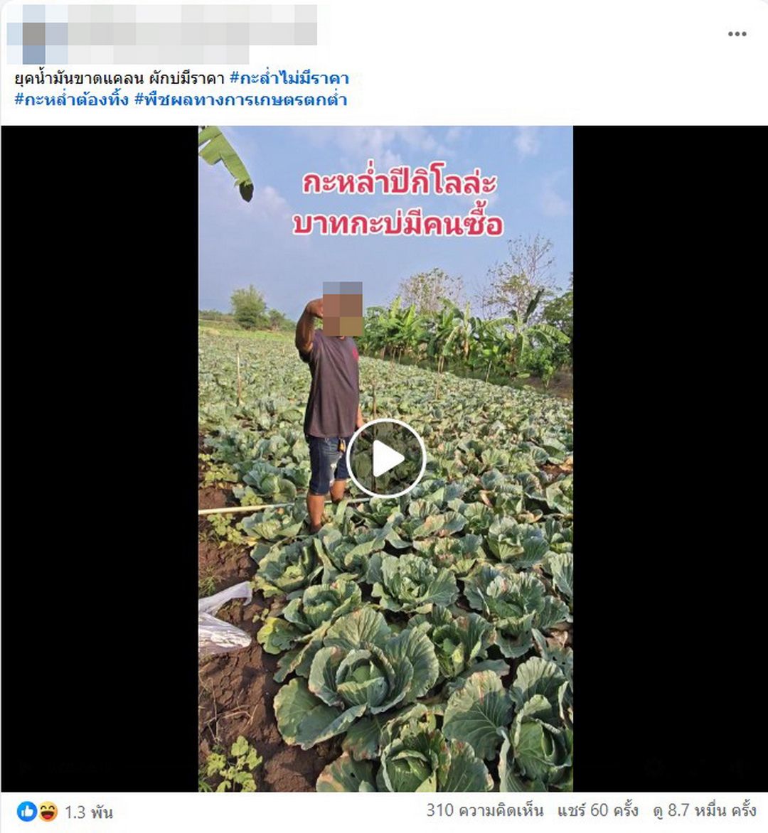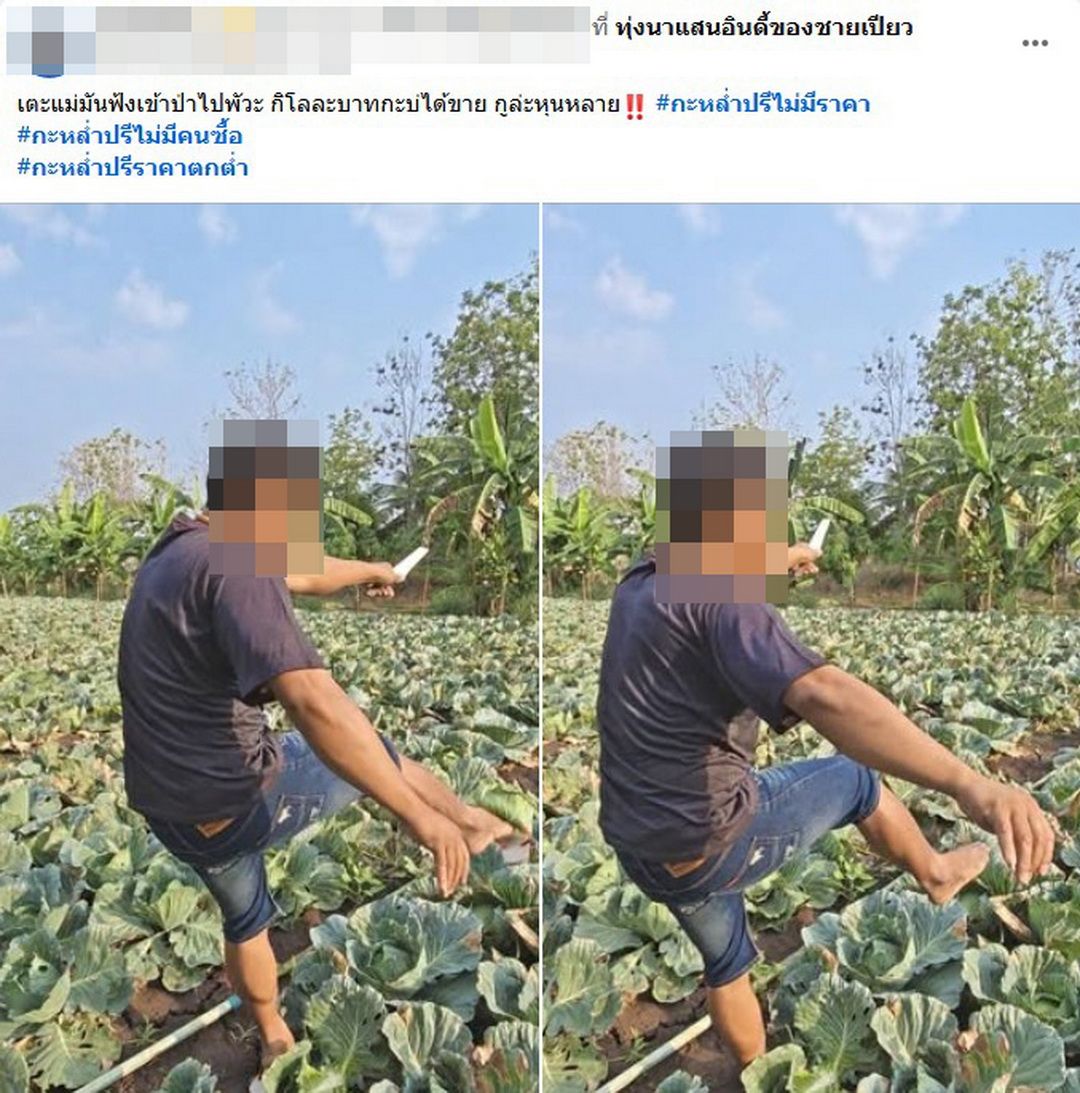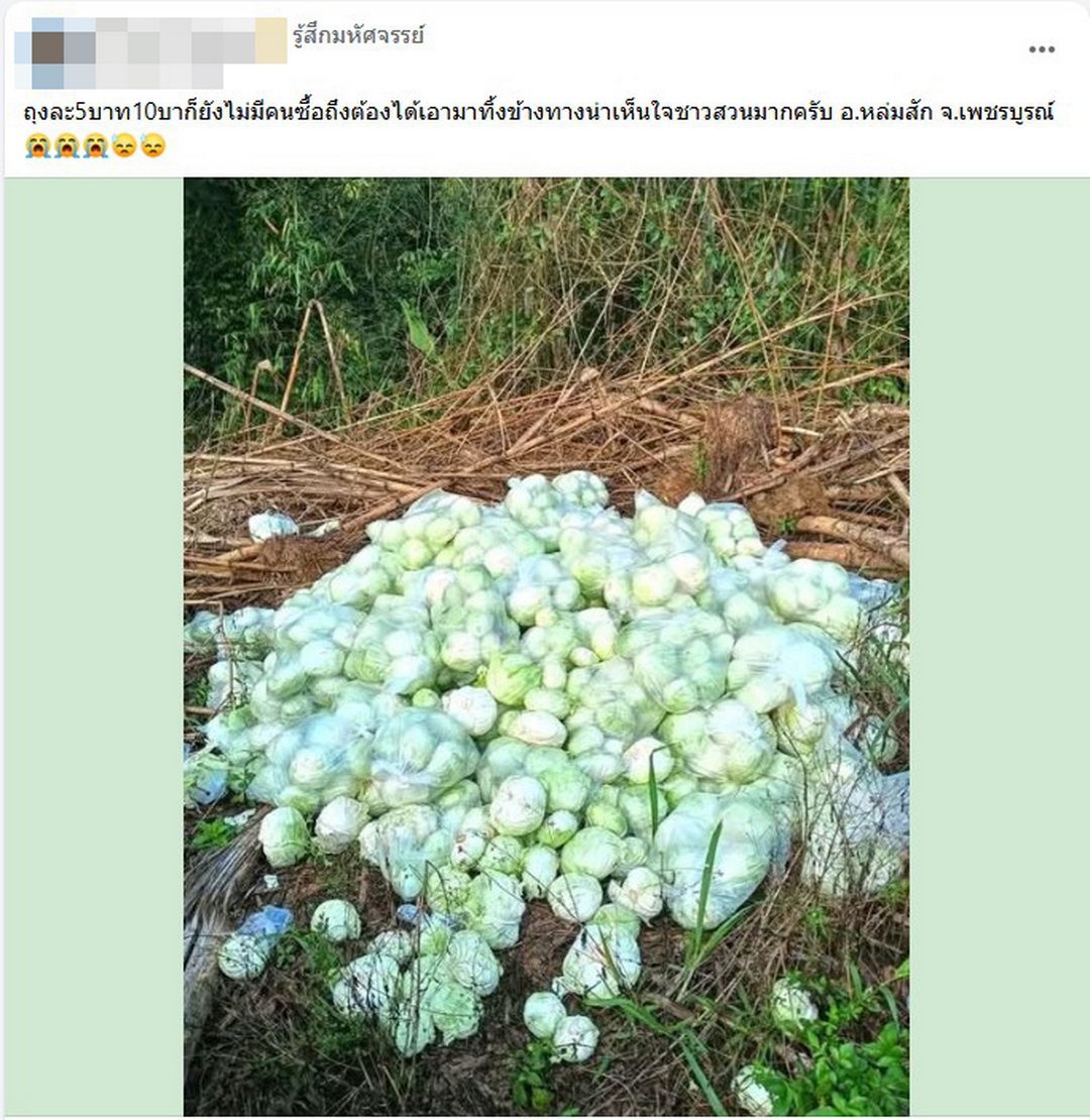 ผู้สื่อข่าวรายงานว่า โลกออนไลน์แชร์วอนคลิปสุดสลดใจจากเกษตรกรอำเภอหล่มสัก จังหวัดเพชรบูรณ์ ที่ออกมาโพสต์สะท้อนความทุกข์ยากผ่านแฮชแท็ก #กะหล่ำไม่มีราคา #กะหล่ำต้องทิ้ง โดยเป็นภาพนาทีชาวสวนตัดกะหล่ำปลีแล้วเตะทิ้งอย่างสิ้นหวัง หลังราคาผลผลิตตกต่ำอย่างรุนแรงจนไม่คุ้มค่าเหนื่อย