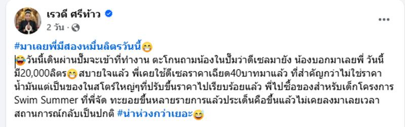 อย่างไรก็ตามก่อนที่ราคาจะขึ้นอย่างเป็นทางการ 6 บาท/ลิตร เรวดี ศรีท้าว อดีตนักกรีฑาทีมชาติไทย โพสต์ข้อความผ่านเฟซบุ๊ก เมื่อวันที่ 24 มีนาคม 2569 ว่า #มาเลยพี่มีสองหมื่นลิตรวันนี้