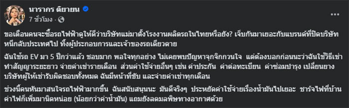 ต๊ะ นารากร ระบุว่า "ขอเตือนคนจะซื้อรถไฟฟ้าดูให้ดีว่าบริษัทแม่มาตั้งโรงงานผลิตรถในไทยหรือยัง? เจ็บกันมาเยอะกับแบรนด์ที่ปิดบริษัทหนีกลับประเทศไป ทิ้งผู้ประกอบการและเจ้าของรถเดียวดาย