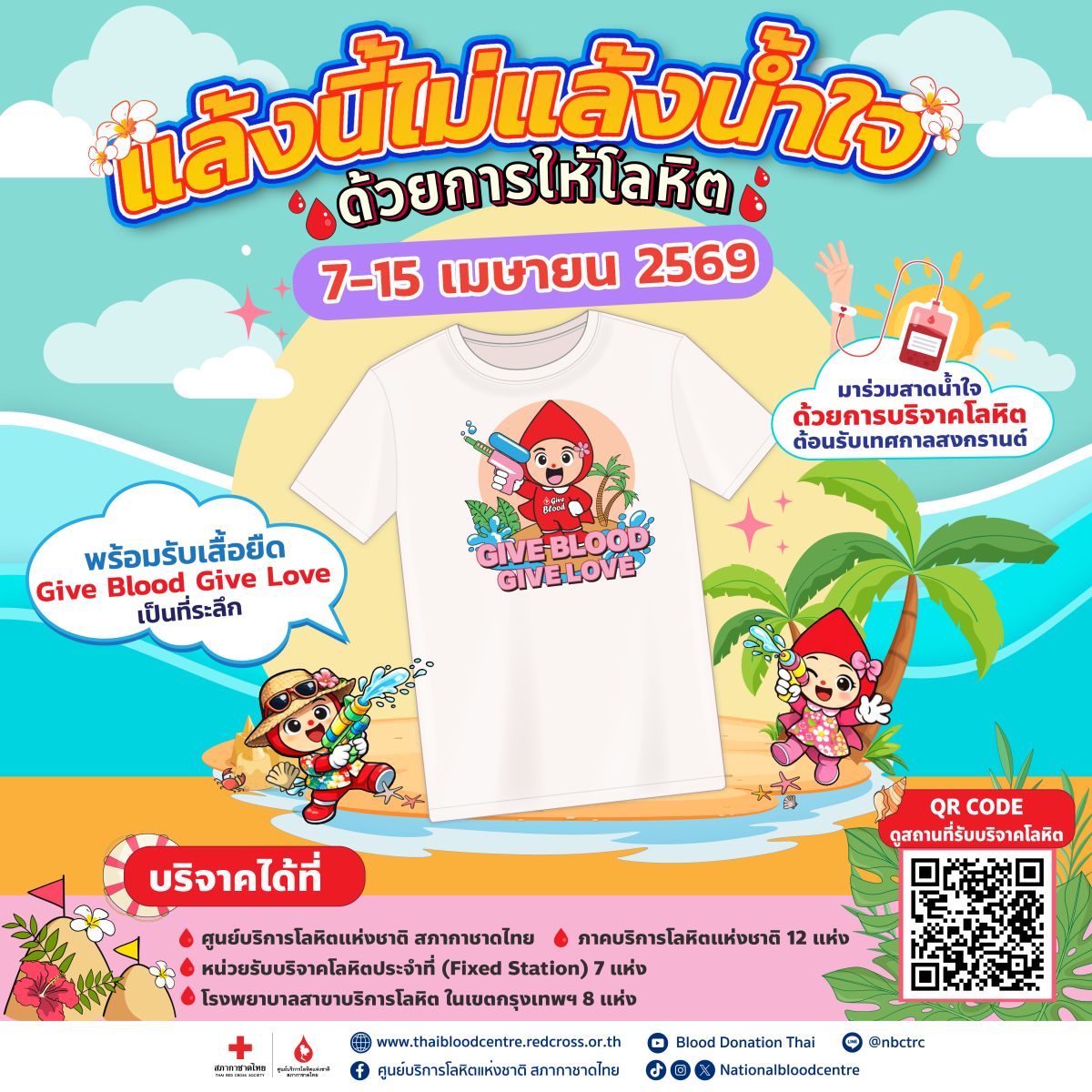 จึงขอเชิญชวนประชาชนร่วมบริจาคโลหิตเตรียมพร้อม ในช่วงเทศกาลสงกรานต์ ในโครงการ “แล้งนี้ ไม่แล้งน้ำใจ ด้วยการให้โลหิต” ระหว่างวันที่ 7 - 15 เมษายน 2569 ( 9 วัน ) เพื่อให้มีโลหิตสำรองเพียงพอสำหรับโรงพยาบาลต่างๆ เพื่อใช้ในกรณีฉุกเฉินได้อย่างทันท่วงที พิเศษ สำหรับผู้บริจาคโลหิตในโครงการฯ รับทันที เสื้อ T-shirt “Give Blood Give Love” เป็นที่ระลึกแทนคำขอบคุณ และเป็นไอเทม ไว้ใส่เล่นน้ำสงกรานต์ปีนี้