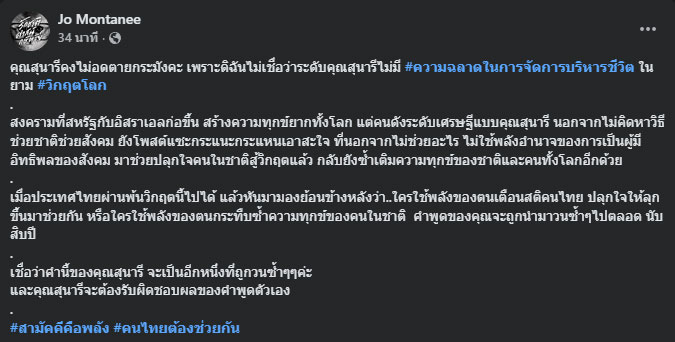 สงครามที่สหรัฐกับอิสราเอลก่อขึ้น สร้างความทุกข์ยากทั้งโลก แต่คนดังระดับเศรษฐีแบบคุณสุนารี นอกจากไม่คิดหาวิธีช่วยชาติช่วยสังคม ยังโพสต์แซะกระแนะกระแหนเอาสะใจ ที่นอกจากไม่ช่วยอะไร ไม่ใช้พลังอำนาจของการเป็นผู้มีอิทธิพลของสังคม มาช่วยปลุกใจคนในชาติสู้วิกฤตแล้ว กลับยังซ้ำเติมความทุกข์ของชาติและคนทั้งโลกอีกด้วย