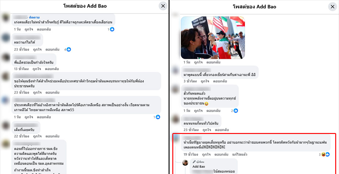 จนมาถึงคอมเมนต์นี้ "น้าเชียร์รัฐบาลยุคเสี่ยหนูหรือ อย่าบอกนะว่าน้าชอบคนพวกนี้ โคตรผิดหวังกับน้ามากๆในฐานะแฟนเพลงคนหนึ่ง" โดย "แอ๊ด คาราบาว" เข้ามาตอบคอมเมนต์สั้นๆ ว่า "ใช้สมองหน่อย"