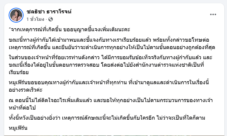 ล่าสุดเฟซบุ๊ก ชลธิชา ธาราโรจน์ หรือ หมูเฟิร์น อินฟลูสาวที่มีผู้ติดตาม 1.6 ล้าน ได้โพสต์ชี้แจงกรณีดังกล่าว โดยระบุว่า " จากเหตุการณ์ที่เกิดขึ้น ขออนุญาตชี้แจงเพิ่มเติมนะคะ ขณะนี้ทางผู้กำกับได้เข้ามาพบและชี้แจงกับทางเราเรียบร้อยแล้ว พร้อมทั้งกล่าวขอโทษต่อเหตุการณ์ที่เกิดขึ้น และยืนยันว่าจะดำเนินการทุกอย่างให้เป็นไปตามขั้นตอนอย่างถูกต้องที่สุด
