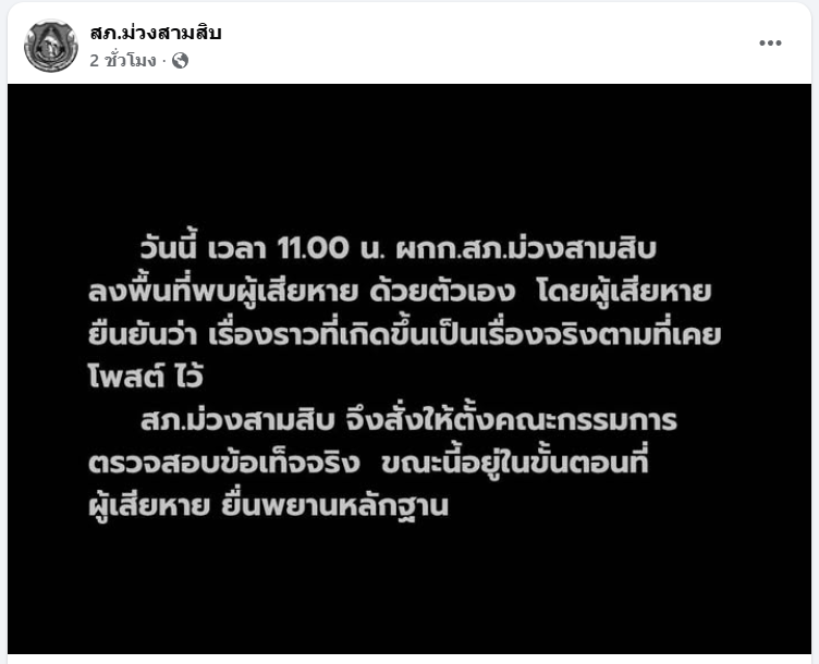 ขณะเดียวกัน สภ.ม่วงสามสิบ ได้โพสต์ข้อความระบุว่า "วันนี้ เวลา 11.00 น. ผกก.สภ.ม่วงสามสิบ ลงพื้นที่พบผู้เสียหาย ด้วยตัวเอง โดยผู้เสียหาย ยืนยันว่า เรื่องราวที่เกิดขึ้นเป็นเรื่องจริงตามที่เคยโพสต์ไว้ สภ.ม่วงสามสิบ จึงสั่งให้ตั้งคณะกรรมการตรวจสอบข้อเท็จจริง ขณะนี้อยู่ในขั้นตอนที่ผู้เสียหาย ยื่นพยานหลักฐาน"