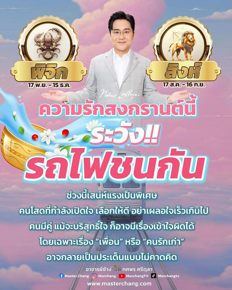 วันที่ 8 เมษายน 2569 ใกล้เข้ามาแล้วสำหรับ ช่วงเทศกาลปีใหม่ไทย (วันสงกรานต์) โดยหมอช้าง ได้ออกมาเตือนทั้งคนโสด คนมีคู่ฟังกันให้ดีว่า ดวงความรักสงกรานต์นี้ ระวัง…! รถไฟชนกัน ช่วงนี้เสน่ห์แรงเป็นพิเศษ คนโสด ที่กำลังเปิดใจ เลือกให้ดี อย่าเผลอใจเร็วเกินไป