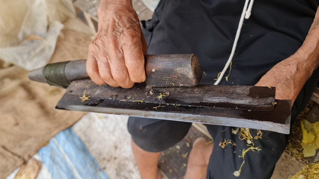 คุณปู่บุญเลิศ คงพูล อายุ 80 ปี ชาวบ้านหมู่ 4 บ้านเตว็ดใน ได้นำม้าหั่นยาโบราณซึ่งเป็นมรดกตกทอดมาจากคุณพ่อออกมาสาธิตการใช้งานให้ชม โดยเผยว่าเครื่องมือชิ้นนี้มีอายุเก่าแก่กว่า 60 ปี แต่ด้วยการดูแลรักษาอย่างดีทำให้สภาพยังคงสมบูรณ์ ตัวรางและใบมีดยังคงมีความคมกริบ พร้อมใช้งานได้เหมือนวันวาน แต่ต้องใช้ความระมัดระวังและทักษะที่สั่งสมมาอย่างยาวนาน