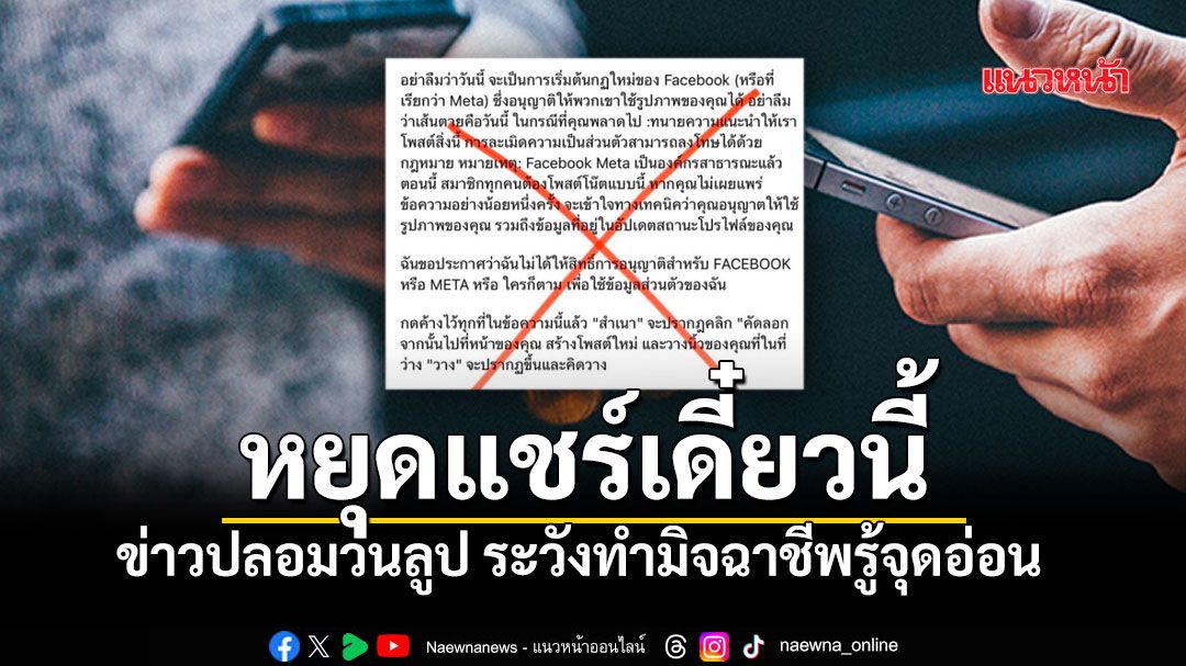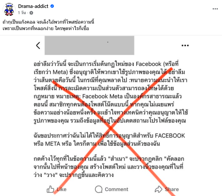 กลายเป็นประเด็นร้อนบนโลกออนไลน์อีกครั้ง เมื่อข้อความไวรัลหน้าตาคุ้นๆ กลับมาระบาดบนหน้าฟีดของผู้ใช้งานเฟซบุ๊ก โดยอ้างว่าหากไม่โพสต์ข้อความตามที่กำหนด Meta (Facebook) จะได้รับสิทธิ์ในการนำรูปภาพและข้อมูลส่วนตัวไปใช้ได้ตามใจชอบ จนเพจดังต้องรีบออกมาเบรก