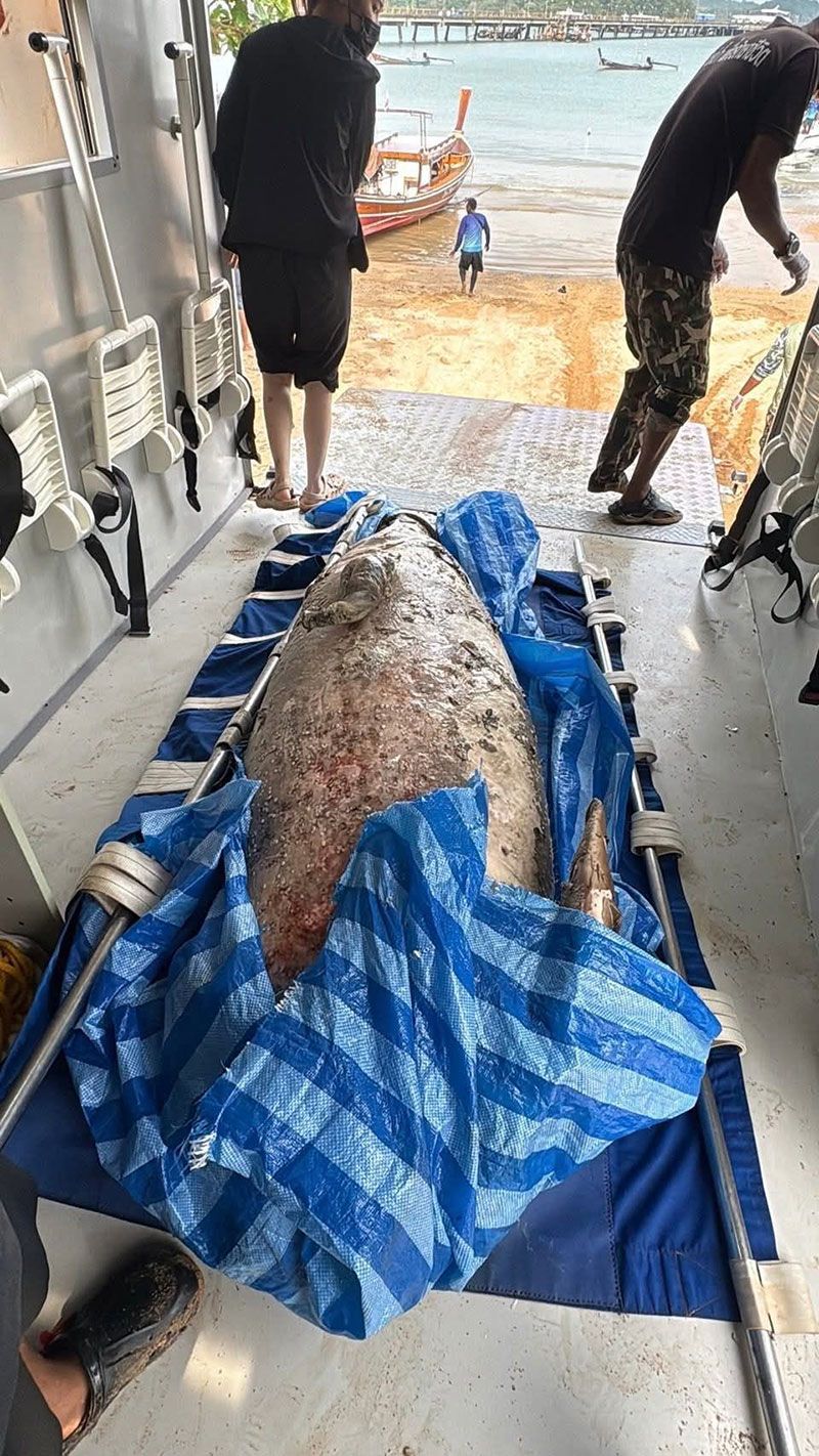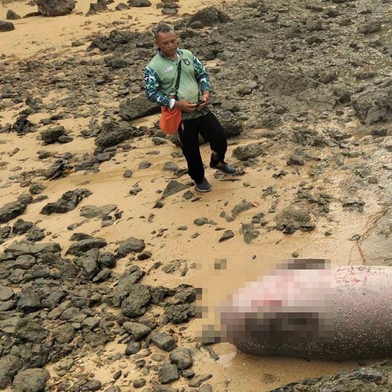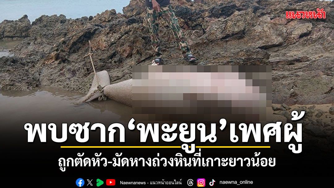 พบพะยูนเพศผู้ยาวกว่า 2 เมตรถูกตัวหัว เชือกมัดหางถ่วงกับก้อนหิน เกยตื้นตายเชาดหาดเกาะยาว เจ้าหน้าที่เร่งตรวจสอบ