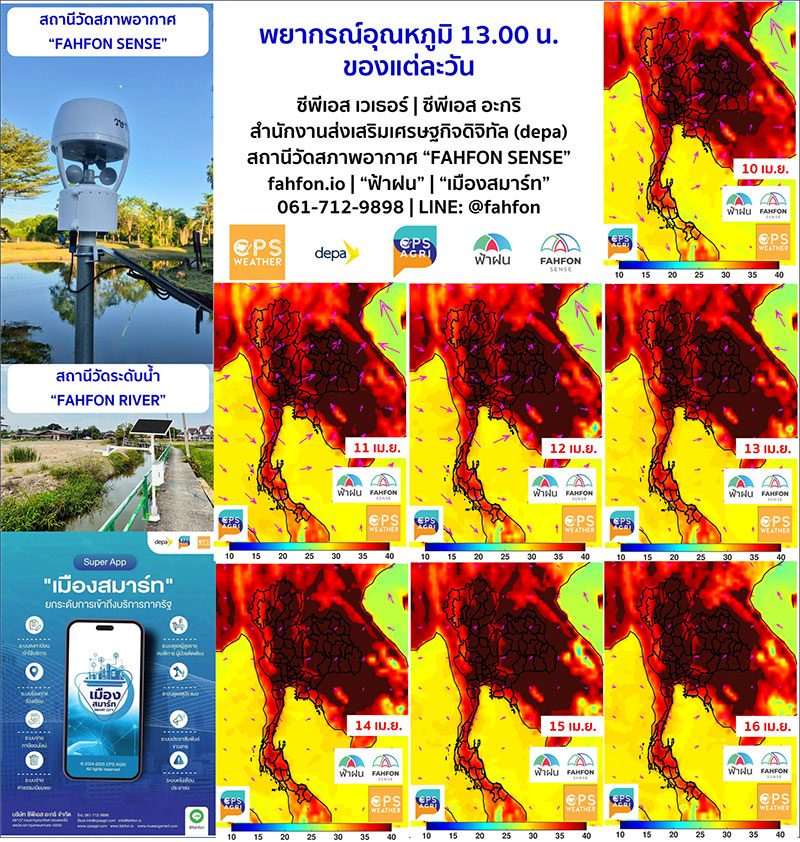 พยากรณ์อุณหภูมิเวลา 13.00 น. ของ 10-16 เม.ย. ! บริเวณดำเดือด คือ อุณหภูมิตั้งแต่ 40 องศาขึ้นไป !