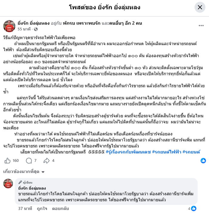 พร้อมยังโพสต์ข้อความในคอมเมนต์อีกว่า "ขายรถแล้วโกยกำไรโดยไม่สนใจลูกค้า ปล่อยให้คนใช้รถมาโวยรัฐบาลว่า ต้องสร้างสถานีชาร์จเพิ่ม แทนที่จะไปโวยคนขายรถ เพราะคนผลิตรถขายรถ ได้ของฟรีจากรัฐไปมากมายแล้ว"