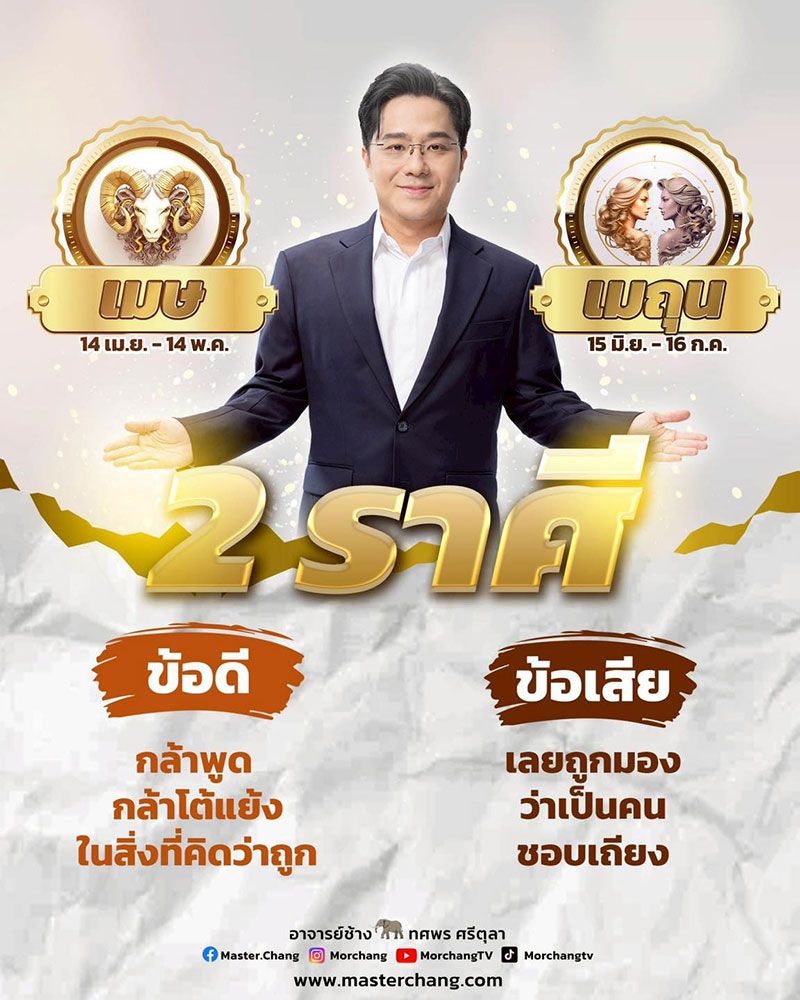 วันที่ 10 เมษายน 2569 หมอช้าง ทศพร ศรีตุลา นักพยากรณ์ชื่อดังด้โพสต์คำทำนายผ่านทางเฟซบุ๊ก หมอช้าง ทศพร ศรีตุลา ระบุว่า ราศี…พูดตรง เพราะจริงใจ แต่บางที…ก็จริงเกินไป #หมอช้าง