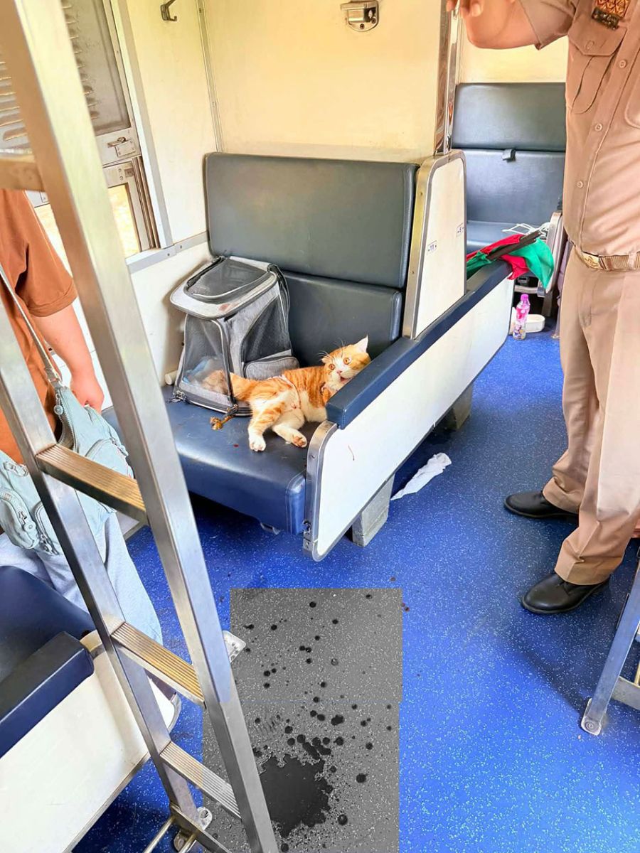 เจ้าหน้าที่รถไฟและพลเมืองดีรวม 3 คน ต้องใช้เวลาเกือบ 20 นาที ในการนำผ้าปูเตียงมาคลุมและตะครุบตัวน้องแมวไว้ได้อย่างทุลักทุเล เพื่อป้องกันไม่ให้ไปกัดผู้โดยสารท่านอื่น โดยเฉพาะเด็กเล็กในขบวน