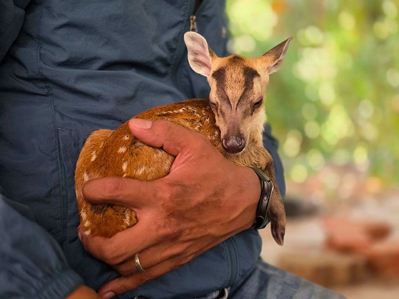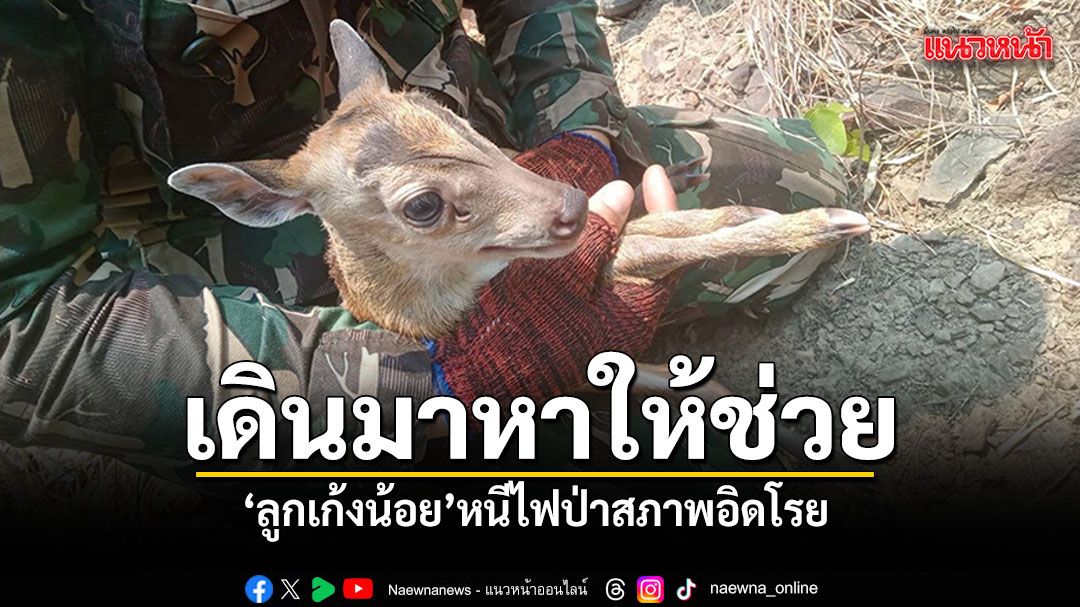 ขณะกำลังช่วยกันเร่งดับไฟ จู่ๆก็มีลูกเก้งหม้อ อายุ 3-4 วัน เดินเข้ามาหาเจ้าหน้าที่ในสภาพอิดโรย และมีอาการหวาดกลัว คาดว่าคงพลัดหลงกับแม่ ระหว่างวิ่งหนีตายจากไฟป่า แต่ยังโชคดีที่มาเจอเจ้าหน้าที่ก่อน ไม่เช่นนั้นน้องก็คงไม่รอด