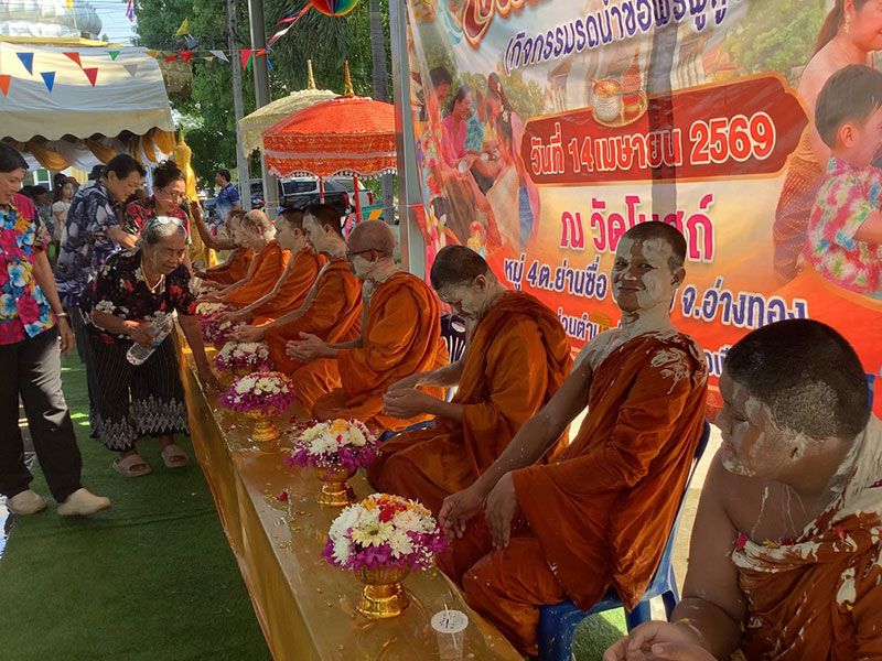 15 เมษายน 2569 สีสันวันสงกรานต์ บรรยากาศ สงน้ำพระเนื่องในวันสงกรานต์ ที่วัดโบสถ์ ตำบลย่านซื่อ อำเภอเมือง จังหวัดอ่างทอง พบว่ามีชาวบ้านมาร่วมพิธีจำนวนมาก สงน้ำพระปะแป้ง กันอย่างสนุกสนาน จนพระสงฆ์หน้าขาวโพลนทั่งหน้า 'พระชุบแป้งทอด' ท่ามกลางเสียงหัวเราะและศรัทธา สร้างรอยยิ้มและความชุ่มฉ่ำใจ สะท้อนประเพณีไทยที่ใกล้ชิดระหว่างวัดกับชุมชน สืบต่อไป
