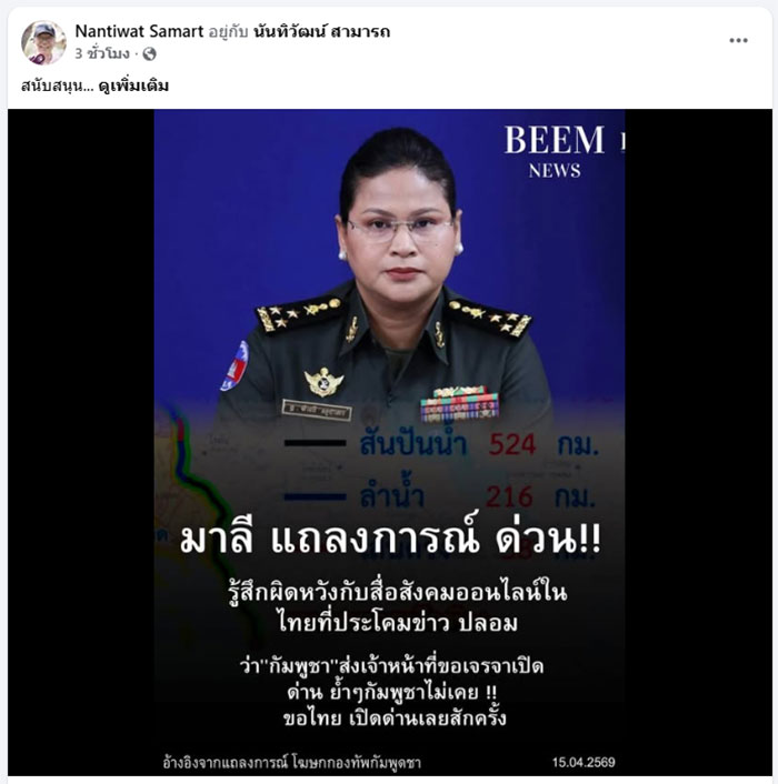 16 เมษายน 2569 นายนันทิวัฒน์ สามารถ อดีตเลขานุการรมว.ต่างประเทศ และอดีตรองผู้อำนวยการสำนักข่าวกรองแห่งชาติ ได้โพสต์ภาพกราฟิกข่าวของ พลโทหญิง มาลี โสเจียตา โฆษกกระทรวงกลาโหมกัมพูชา ที่มีข้อความว่า "มาลี แถลงการณ์ ด่วน!! รู้สึกผิดหวังกับสื่อสังคมออนไลน์ในไทยที่ประโคมข่าว ปลอม ว่า "กัมพูชา" ส่งเจ้าหน้าที่ขอเจรจาเปิดด่าน ย้ำๆ กัมพูชาไม่เคย!! ขอไทย เปิดด่านเลยสักครั้ง อ้างอิงจากแถลงการณ์ โฆษกกองทัพกัมพูดชา 15.04.2569"