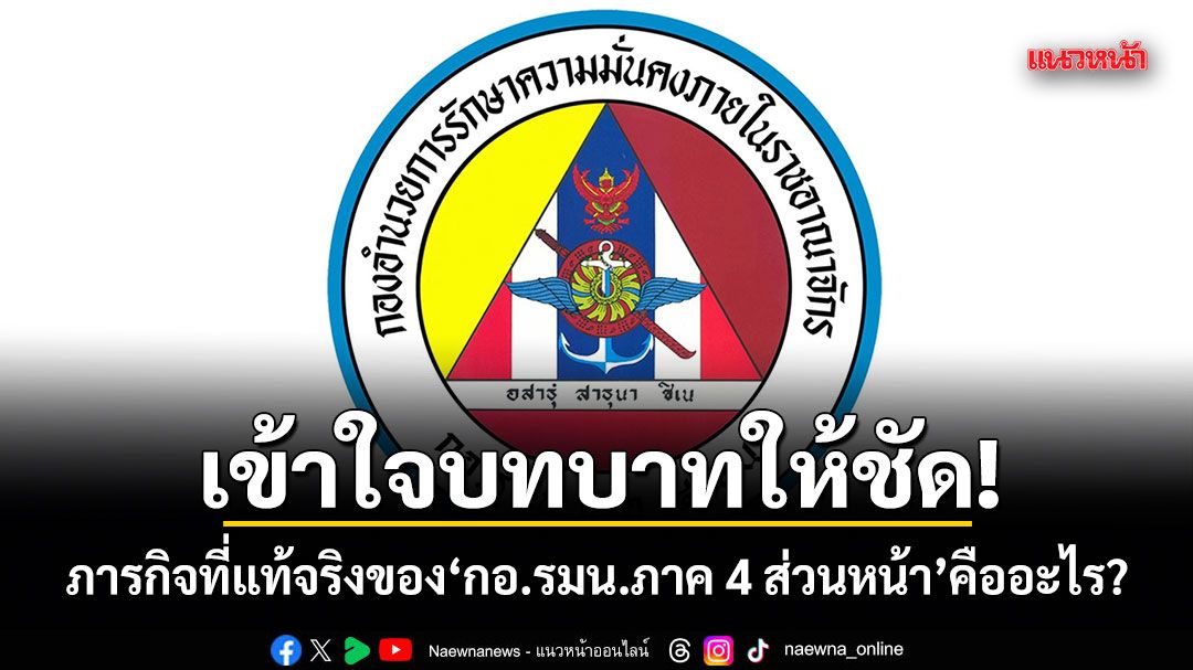 16 เมษายน 2569 เพจเฟซบุ๊ก "กองอำนวยการรักษาความมั่นคงภายในภาค 4 ส่วนหน้า" โพสต์ข้อความระบุว่า ภารกิจที่แท้จริงของ กอ.รมน.ภาค 4 ส่วนหน้า คืออะไร? เข้าใจบทบาทให้ชัด!
