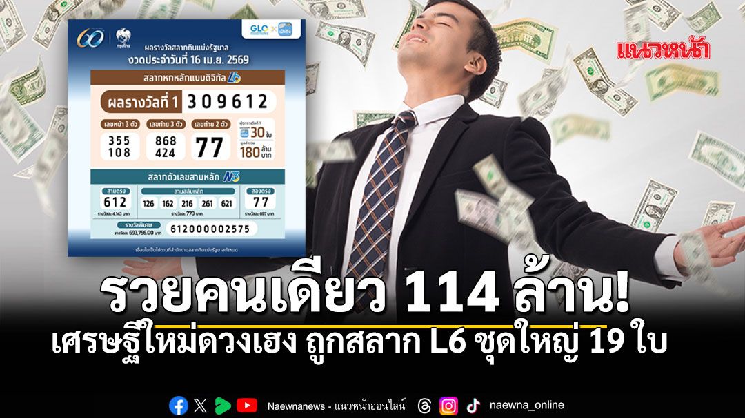 Krungthai Care เผยผล สลากดิจิทัล L6 งวดประจำวันที่ 16 เม.ย. 69 รางวัลที่ 1 เลขที่ 309612 จำนวนใบที่ถูกทั้งหมด 30 ใบ รวมเป็นเงินรางวัล 180 ล้านบาท
