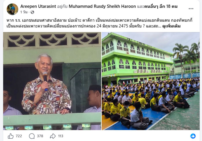 17 เมษายน 2569 นายอารีเพ็ญ อุตรสินธุ์ อดีต สส.นราธิวาส โพสต์ข้อความผ่านเฟซบุ๊ก ระบุว่า "หาก ร.ร. เอกชนสอนศาสนาอิสลาม ปอเน๊าะ ตาดีกา เป็นแหล่งบ่มเพาะความคิดแบ่งแยกดินแดน กองทัพบกก็เป็นแหล่งบ่มเพาะความคิดเปลี่ยนแปลงการปกครอง 24 มิถุนายน 2475 มั้ยครับ ? และสถาบันมหาวิทยาลัยไม่ว่าจะเป็นธรรมศาสตร์หรือจุฬาฯก็เป็นแหล่งบ่มเพาะความคิดของนักศึกษาบางคนไปร่วมกับพรรคคอมมิวนิสต์ หลัง 6 ตุลาคม 2519 มั้ยครับ ? แต่สภาพความเป็นจริงในปัจจุบัน คนที่เรียนจากตาดีกา ปอเนาะ และโรงเรียนเอกชนสอนศาสนาอิสลาม ในชีวิตประจำวันสื่อกันในภาษาไทยส่วนใหญ่แล้วครับ !"