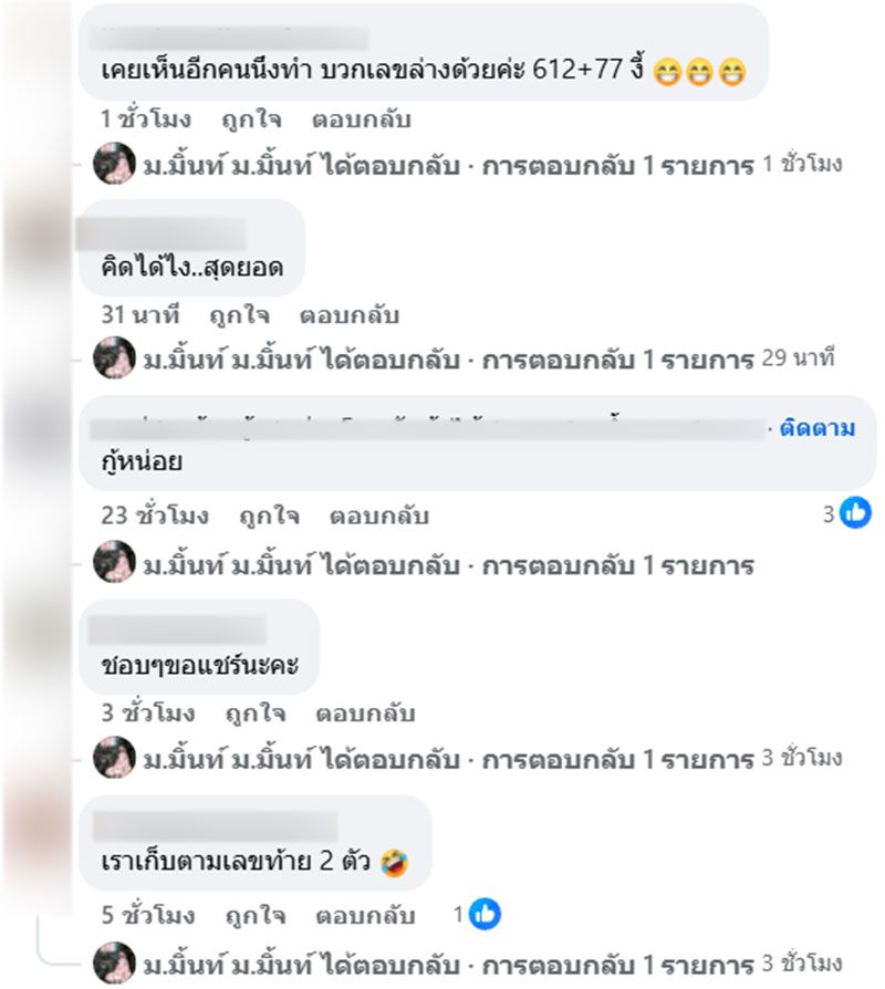 โดยโพสต์ของเธอได้รับความสนใจจำนวนมาก ต่างก็บอกว่า " วิธีนี้เริ่ดอ่ะ , น่าสนุก จะลองทำบ้างนะคะ , ไอเดียร์ดีจังเลย ลองมั่ง , ต้องลองใช้วิธีบ้างซะแล้วค่ะ แถมบางคนยังแซวเธอด้วยว่า เลขท้ายรางวัลที่ 1 ก็ออกแต่ตัวเลขสูงๆซะด้วยสิ