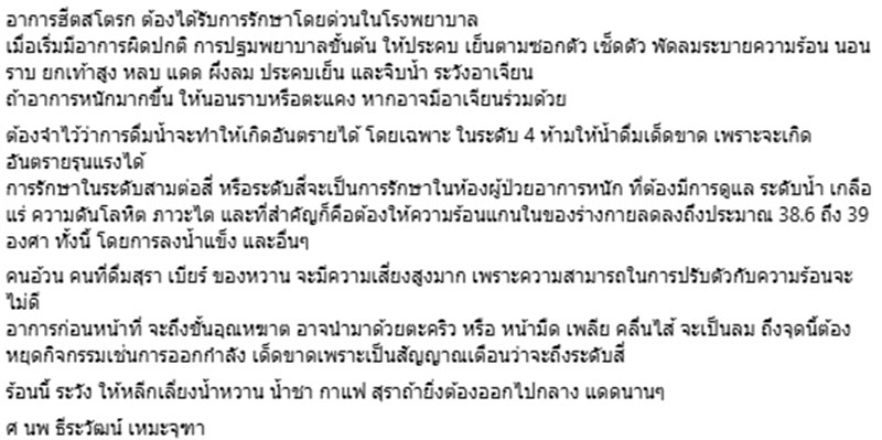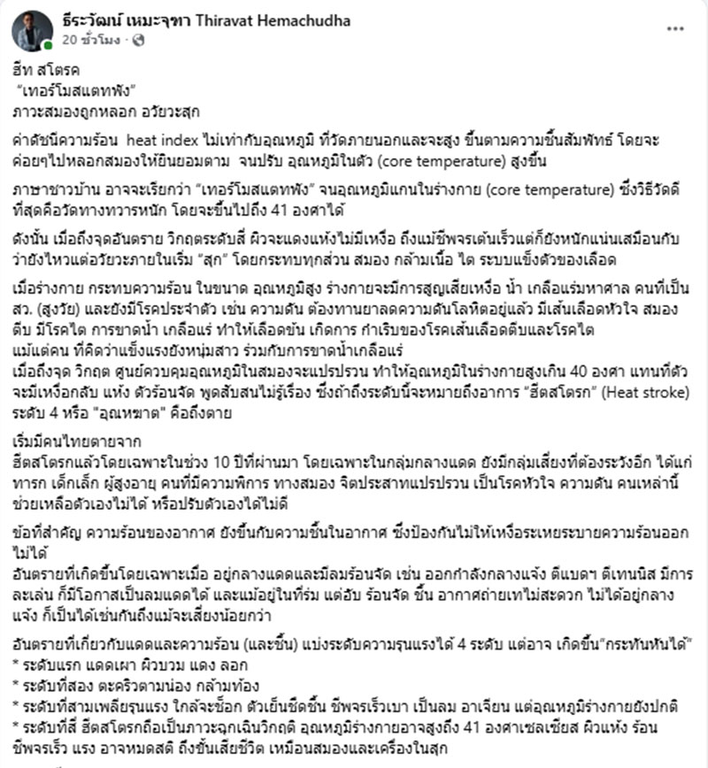 วันที่ 19 เมษายน 2569 ศ.นพ.ธีระวัฒน์ เหมะจุฑา ศูนย์ความเป็นเลิศด้านการแพทย์บูรณาการและสาธารณสุข และที่ปรึกษาวิทยาลัยการแพทย์แผนตะวันออก มหาวิทยาลัยรังสิต โพสต์เฟซบุ๊ก “ธีระวัฒน์ เหมะจุฑา Thiravat Hemachudha” ระบุว่า ฮีท สโตรค “เทอร์โมสแตทพัง” ภาวะสมองถูกหลอก อวัยวะสุก