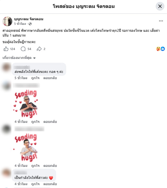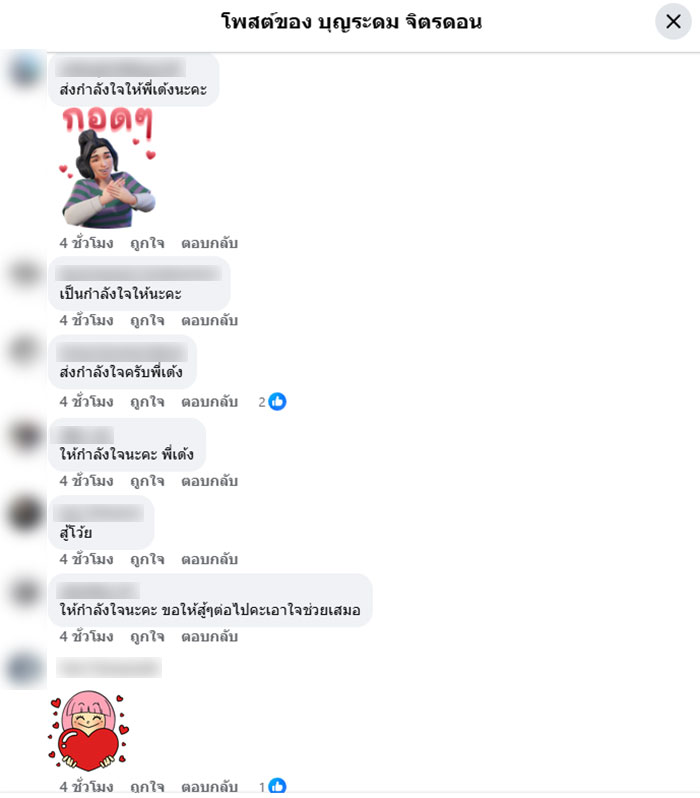 ทั้งนี้ ภายหลังโพสต์ดังกล่าวเผยแพร่ออกไป มีผู้เข้ามาแสดงความคิดเห็นเป็นจำนวนมาก อาทิ ส่งพลังใจให้พี่เด้งนะคะ กอด ๆ ค่ะ , เป็นกำลังใจให้พี่สาวค่ะ , ส่งกำลังใจให้พี่เด้งนะคะ , เป็นกำลังใจให้นะคะ , ส่งกำลังใจครับพี่เด้ง , ให้กำลังใจนะคะ พี่เด้ง , สู้โว้ย , ให้กำลังใจนะคะ ขอให้สู้ๆต่อไปคะเอาใจช่วยเสมอ เป็นต้น