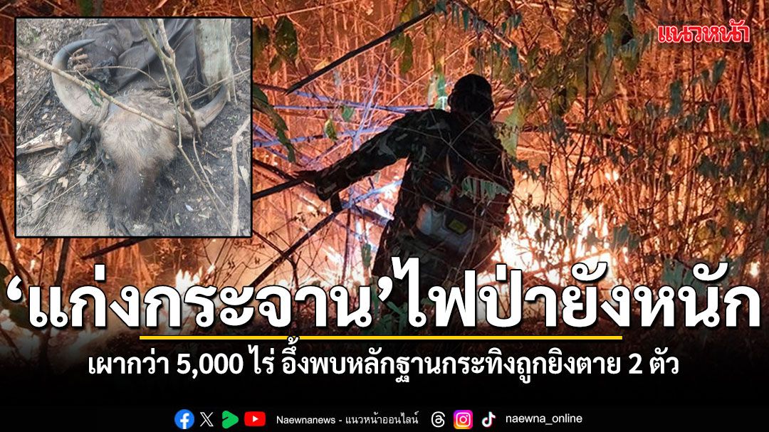 สภาพไฟป่าแก่งกระจานลุกลามหนักแล้วมีพื้นที่ถูกเผากว่า 5,000 ไร่ พบหลักฐานแก๊งล่ากระทิงหลังพบศพกระทิง ถูกปืนลูกซอง แบบ 9 เม็ด ยิงตายในพื้นที่เกิดเหตุเชื่อต้นตอสาเหตุ เร่งวางแผนการทำงานของคดี