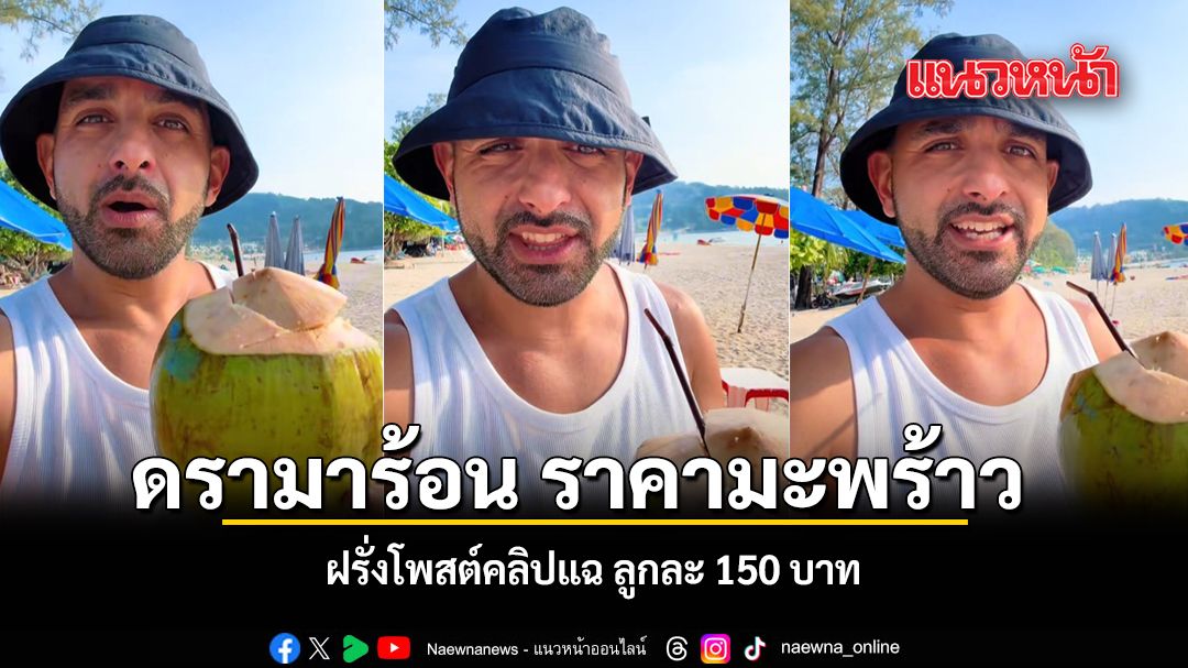 วานนี้ 22 เมษายน 2569 กลายเป็นดราม่าร้อนฉ่ารับลมร้อนที่ภูเก็ต เมื่อชาวต่างชาติเจ้าของบัญชี TikTok ชื่อ rk.k1ng ได้โพสต์คลิปวิดีโอความยาว 18 วินาที ขณะยืนถือมะพร้าวอยู่บริเวณหาดป่าตอง จ.ภูเก็ต พร้อมระบายความอัดอั้นใจเรื่องราคาที่พุ่งสูงปรี๊ด โดยในคลิปชาวต่างชาติรายนี้ได้พูดเป็นภาษาไทยว่า "ตอนนี้ผมอยู่หาดป่าตอง ผมซื้อมะพร้าวกิน 150 บาท... แพงเกินไปมาก ที่บ้านผมแค่ 25 เอง..." พร้อมระบุแคปชั่นประกอบวิดีโอว่า "Coconut price in Patong Phuket $150 baht!!! Thaiiii hong! #patong #thailand #phuket #coconut"
