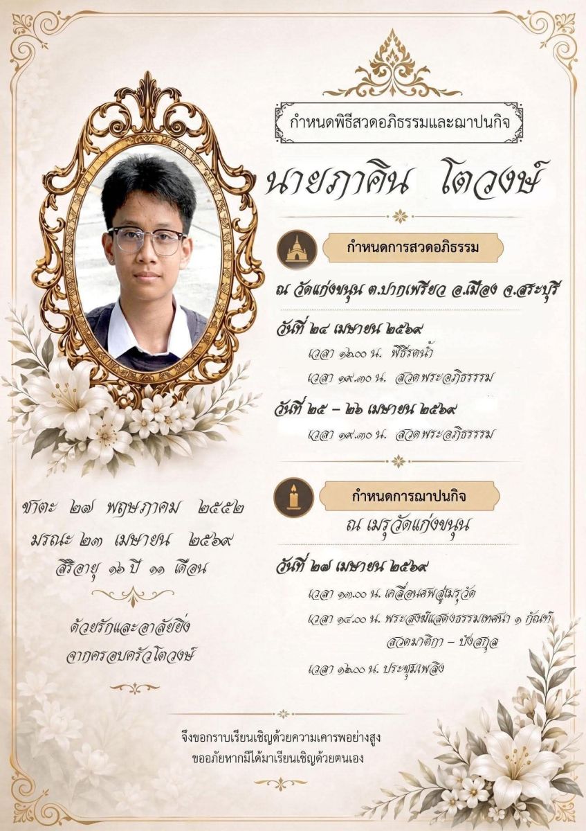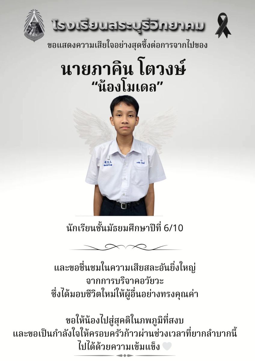 สุดอาลัย "น้องโมเดล" นร.ม.6 สระบุรีวิทยาคม เสียชีวิตจากอุบัติเหตุ มอบร่างสร้างกุศลใหญ่ บริจาคอวัยวะต่อลมหายใจให้ผู้อื่น