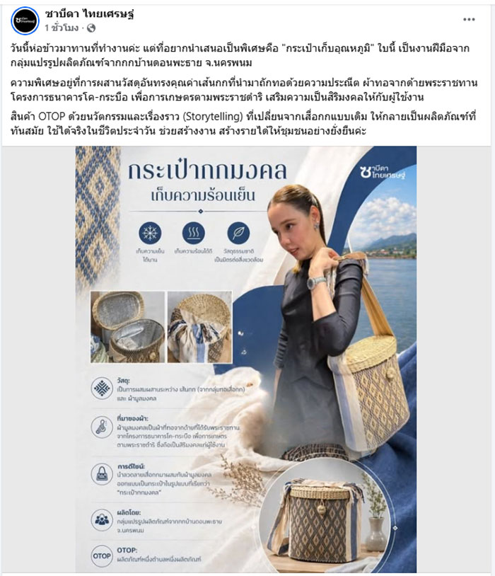 24 เมษายน 2569 น.ส.ซาบีดา ไทยเศรษฐ์ รัฐมนตรีว่าการกระทรวงวัฒนธรรม โพสต์ข้อความผ่านเฟซบุ๊ก ระบุว่า วันนี้ห่อข้าวมาทานที่ทำงานค่ะ แต่ที่อยากนำเสนอเป็นพิเศษคือ "กระเป๋าเก็บอุณหภูมิ" ใบนี้ เป็นงานฝีมือจาก กลุ่มแปรรูปผลิตภัณฑ์จากกกบ้านดอนพะธาย จ.นครพนม